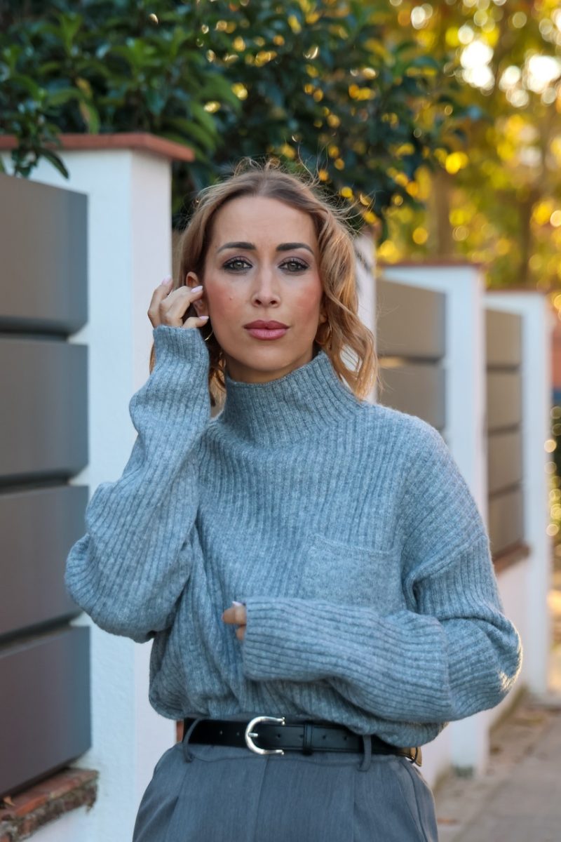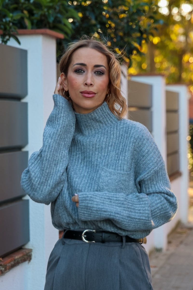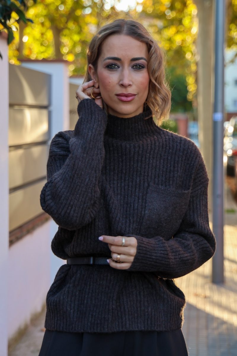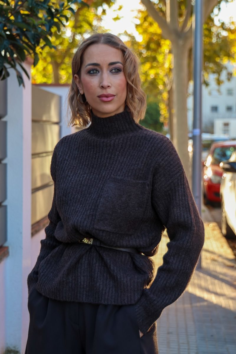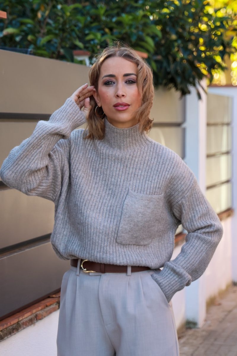 Su tejido de lana con acabado canalé ofrece máxima comodidad y un ajuste favorecedor. El cuello alto y el bolsillo frontal aportan un toque moderno ideal para combinar con pantalones de vestir, denim o faldas.