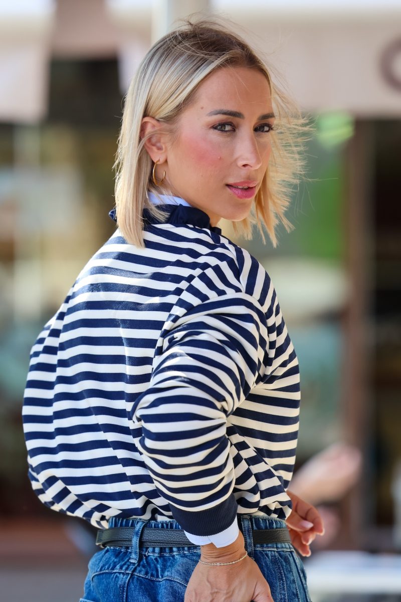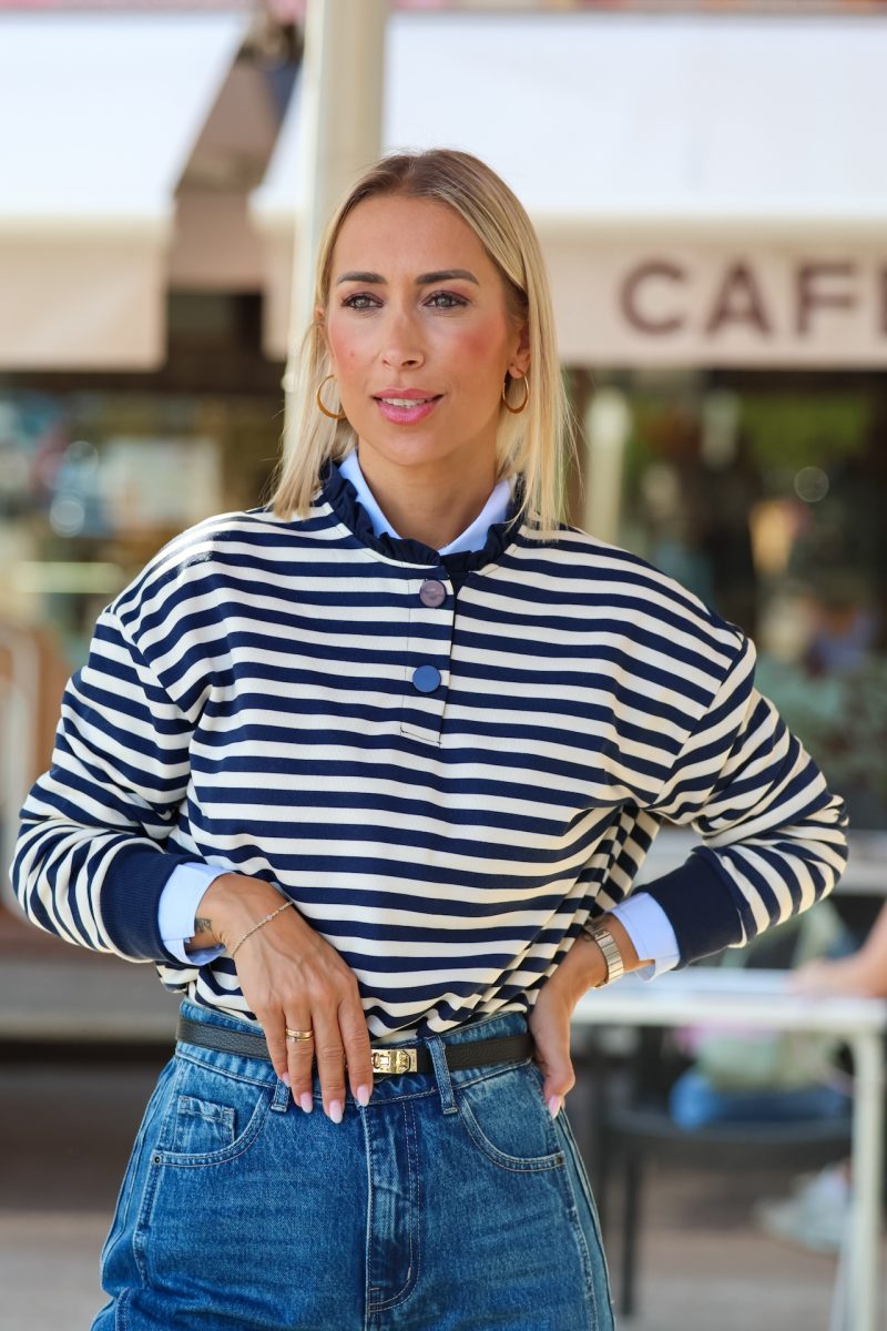Jersey marino a rayas estilo casual con detalle reumático. Jersey estampado de rayas marino y crudo atemporal, Cuello redondo con volante fruncido y cierre parcial de botones. Manga larga con puños elásticos, Corte recto y cómodo, ligeramente suelto. Bajo y puños en canalé para un mejor ajuste,