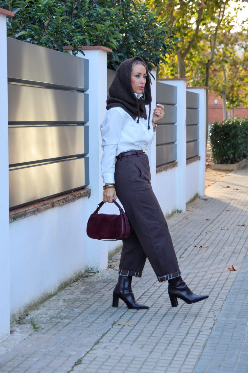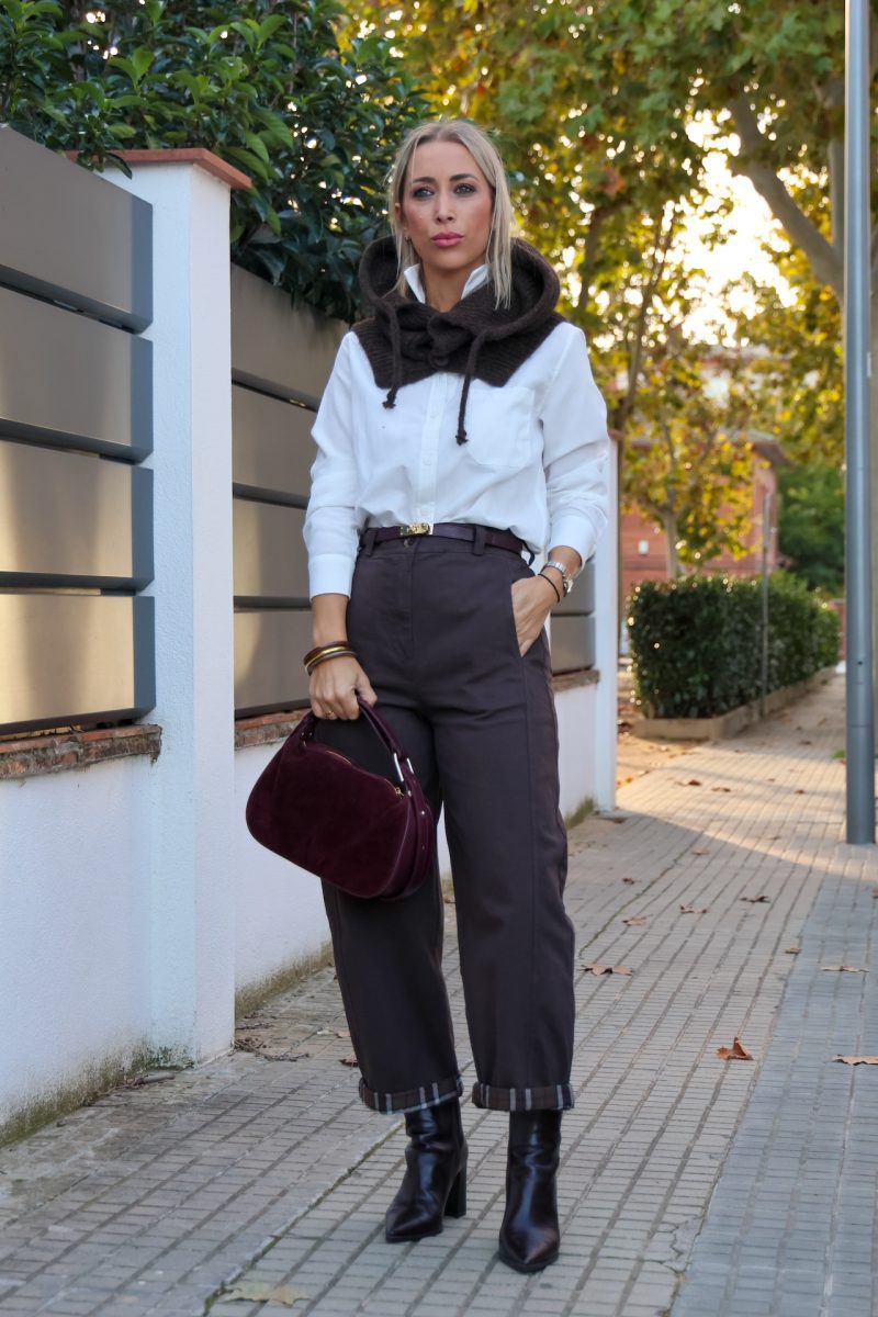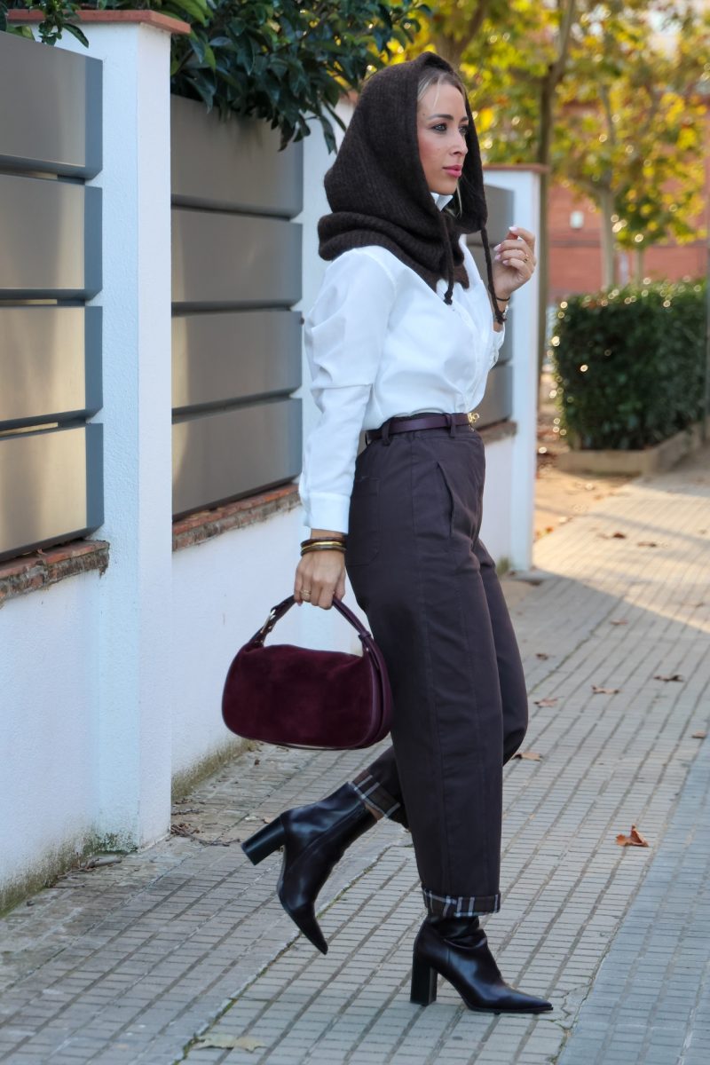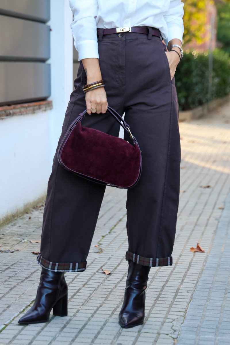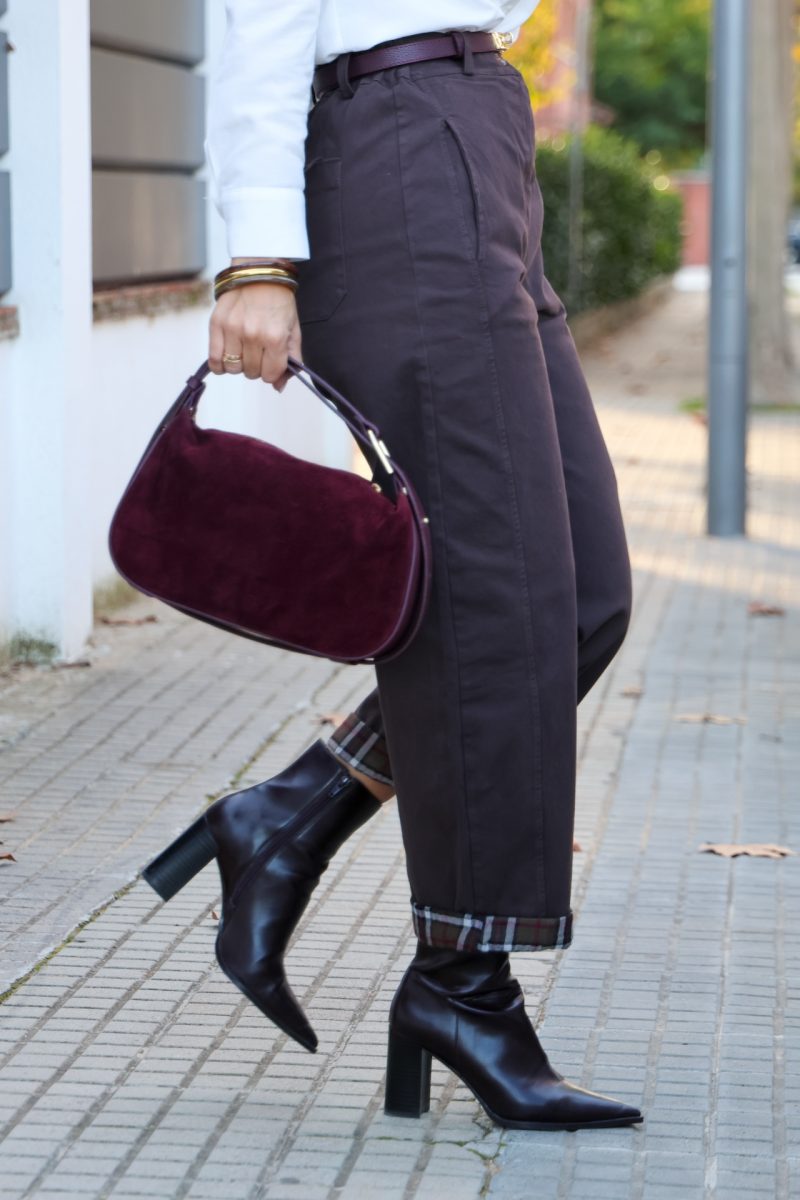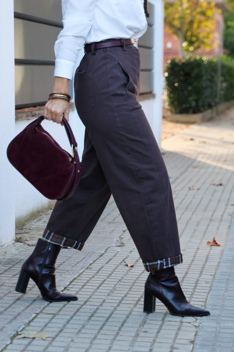 Pantalón baggy tipo denim en color marrón, con cierre de cremallera y botón. Cintura con elástico y presillas para poner cinturón. Bolsillos traseros y laterales funcionales. Bajo con dobladillo de cuadros, posibilidad de bajar el dobladillo.