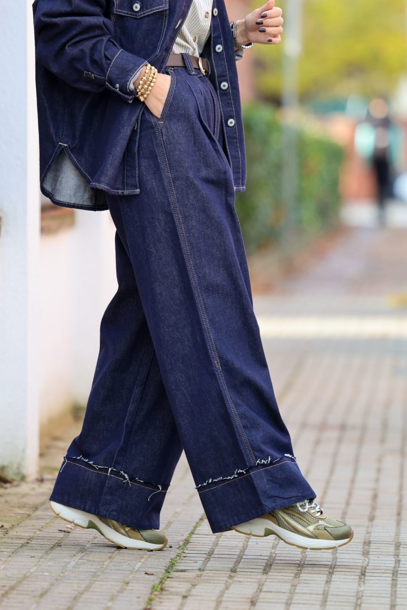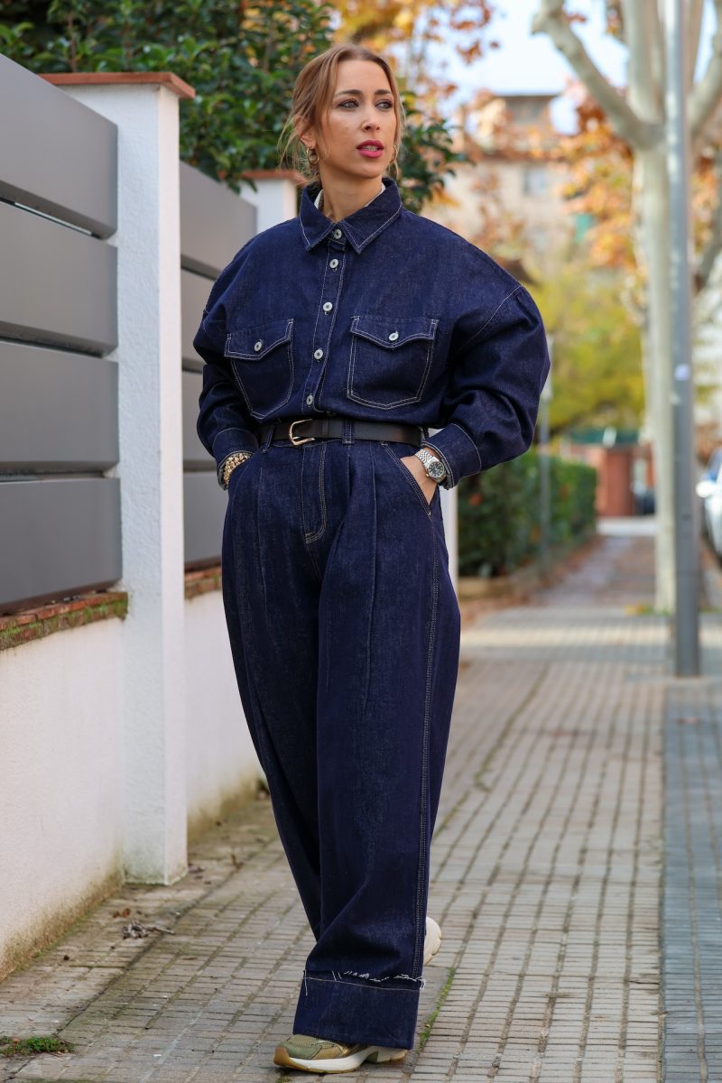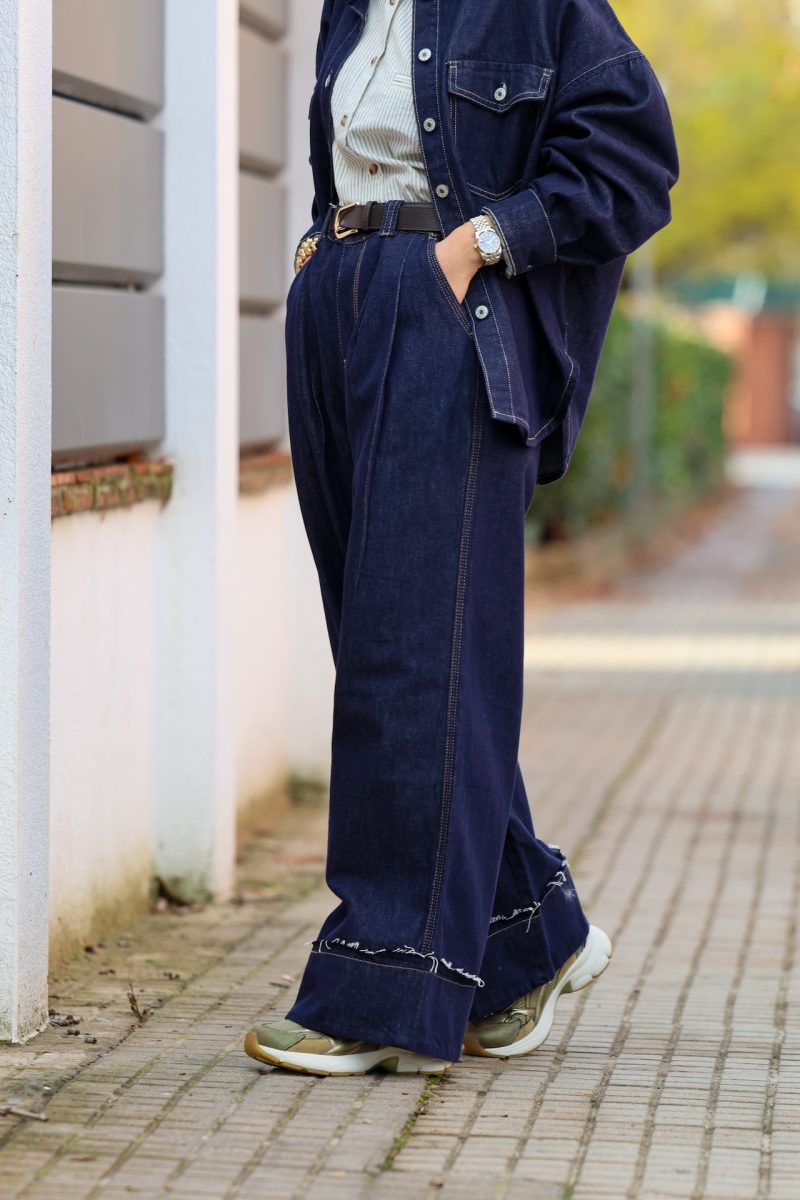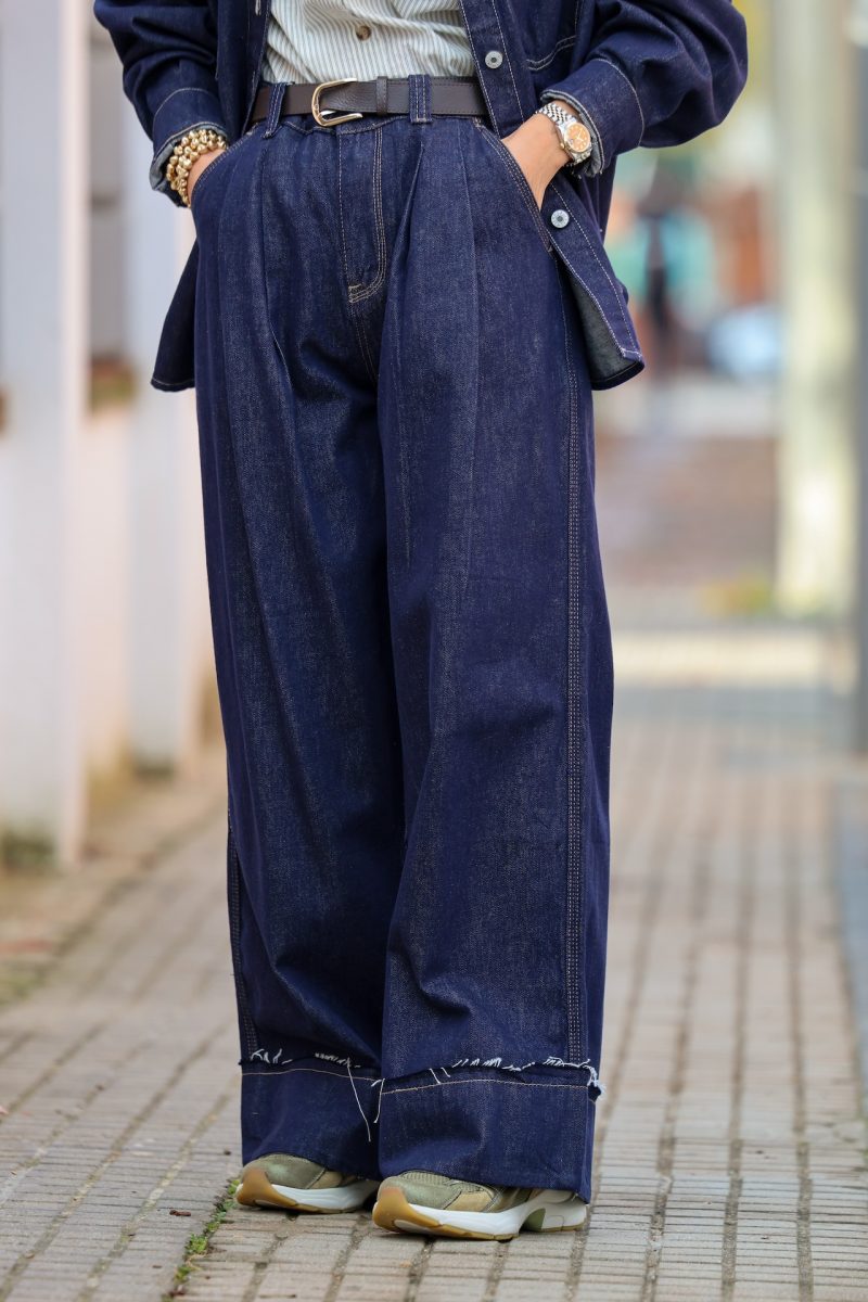 Pantalón denim de pierna ancha con pinzas en la cintura. Tallaje completo.