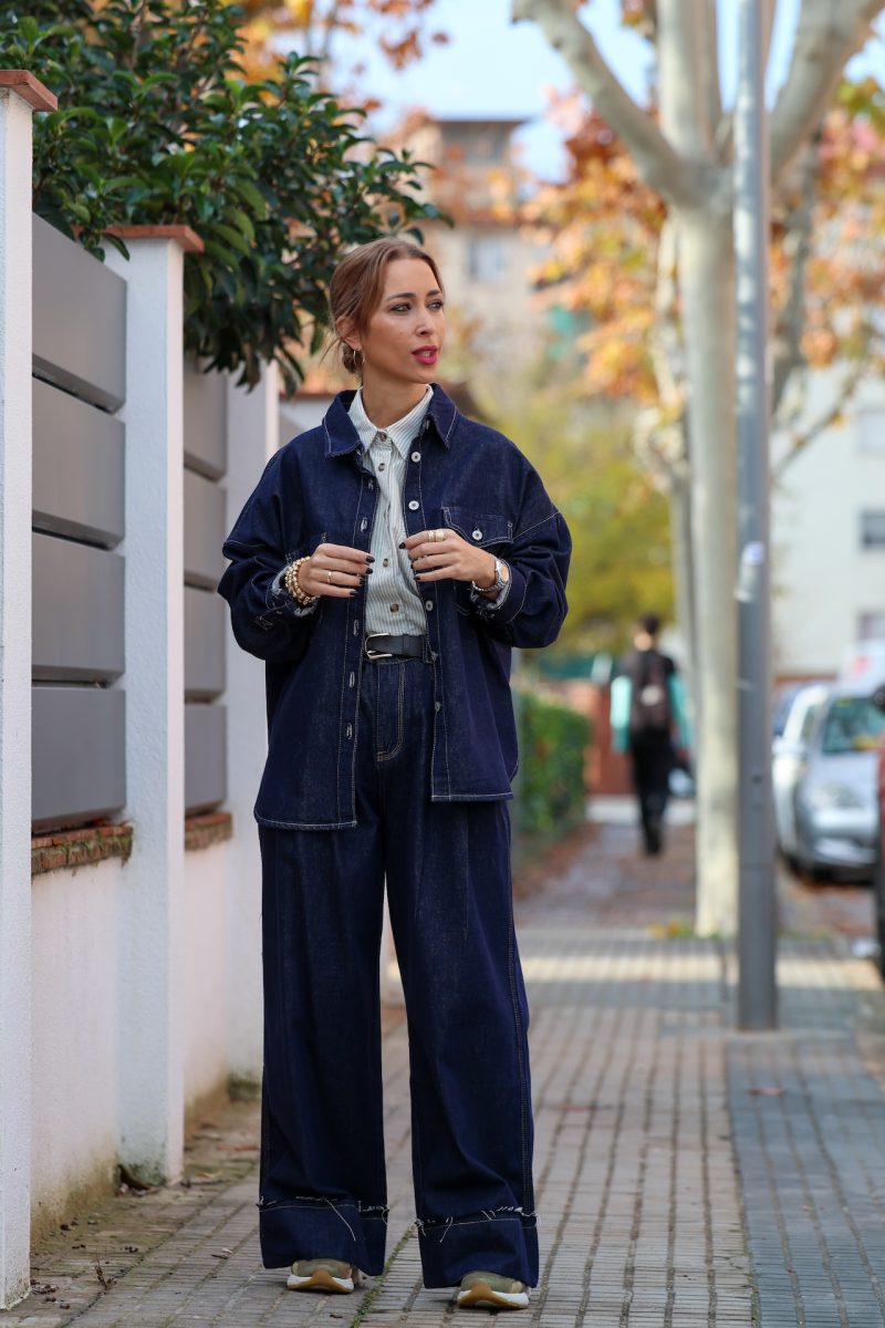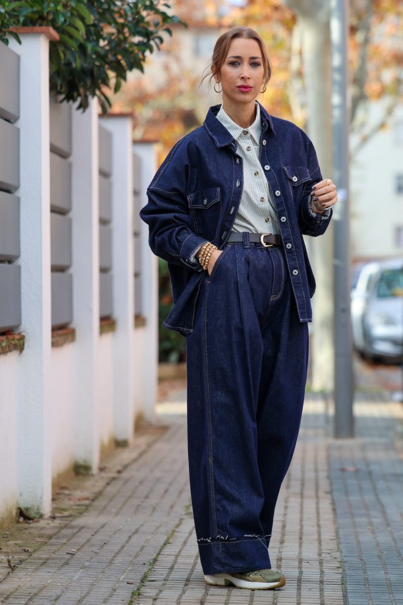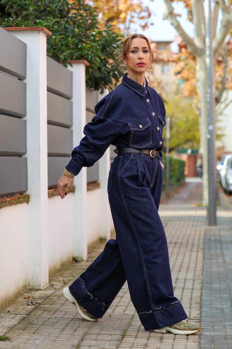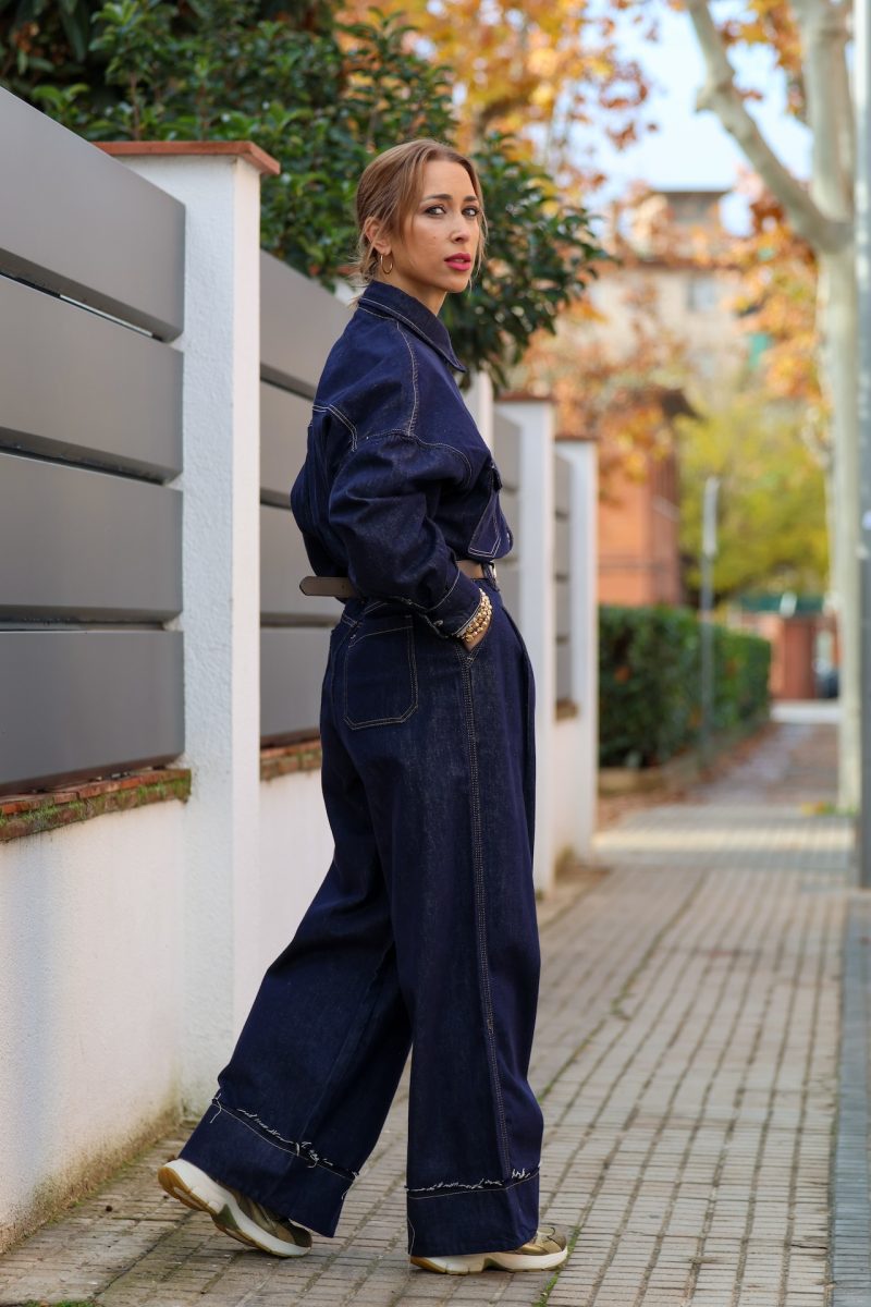 Pantalón denim de pierna ancha con pinzas en la cintura. Tallaje completo.