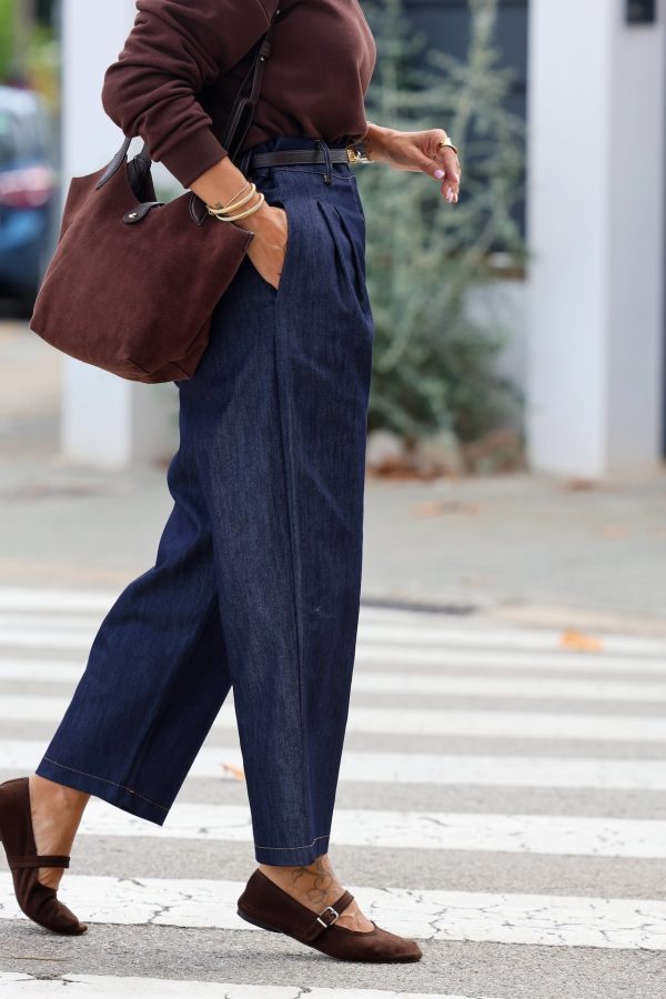 Pantalon de tiro alto en color azul marino, simulando un denim. Confeccionado con pinzas delanteras que estilizan la figura y aportan un toque sofisticado. Su corte recto ligeramente afilado hacia el tobillo lo hace cómodo y moderno a la vez. Incluye bolsillos laterales y cierre clásico con cremallera y botones. Perfecto para combinar tanto con blusas y camisas para un look formal, como con camisetas y zapatillas para un estilo más casual.