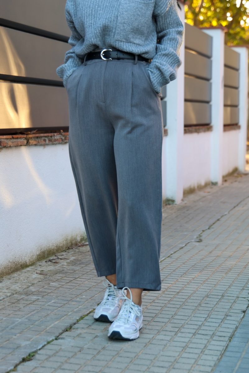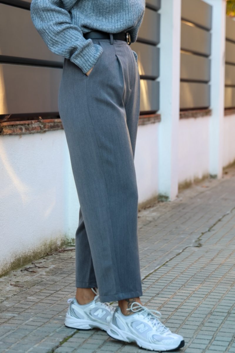 Este pantalón carrot en tono gris ofrece un corte moderno y favorecedor: cintura alta, pinzas frontales y pernera ligeramente afilada que estiliza la figura. Perfecto para looks casual, de oficina o combinaciones más elegantes.