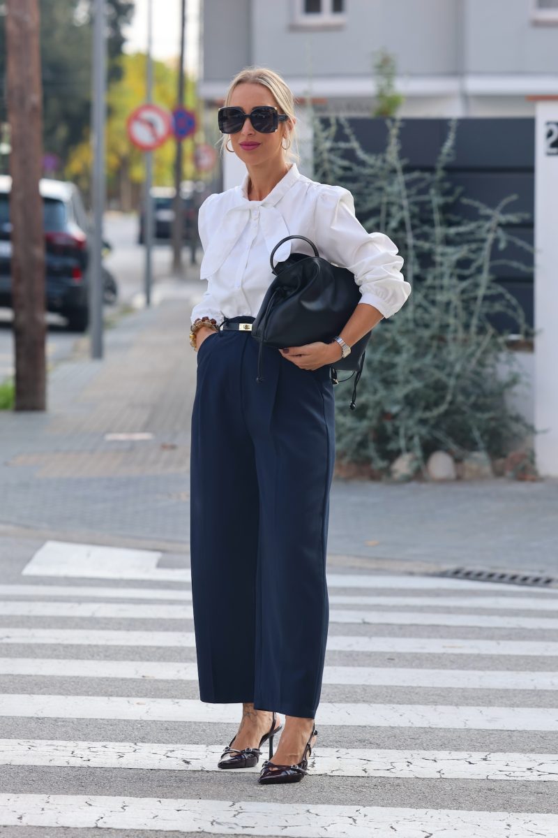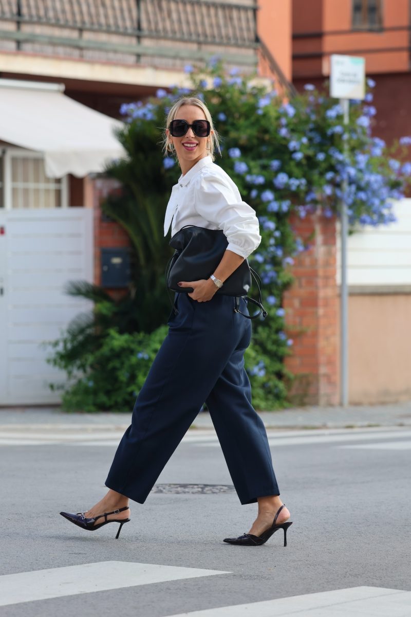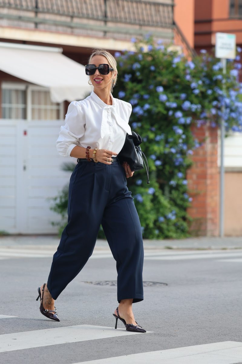 De talle alto y ligeramente abombado en la cadera, estiliza la figura y aporta un aire sofisticado a cualquier look.