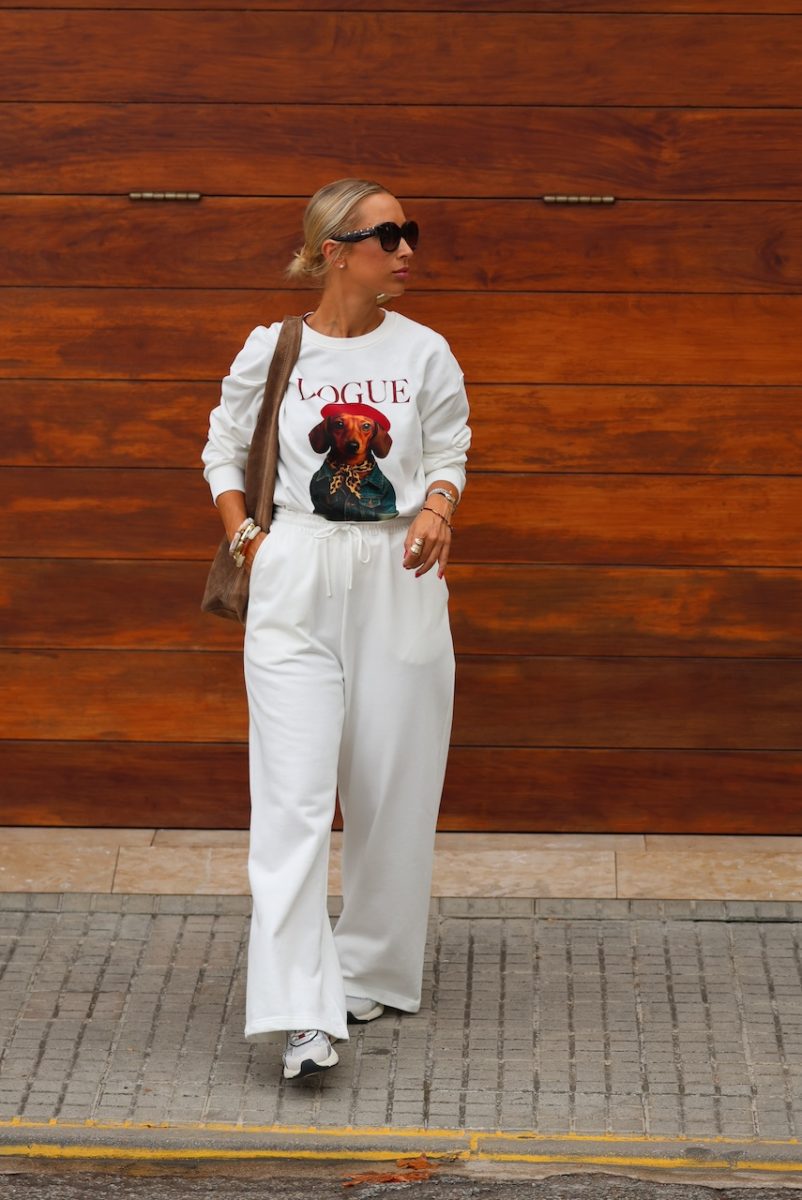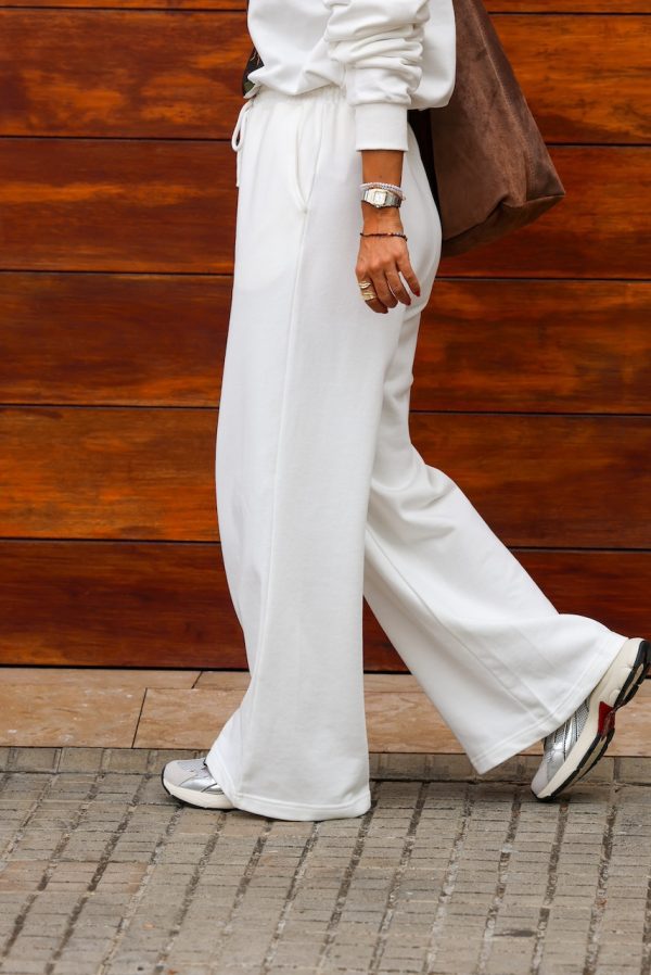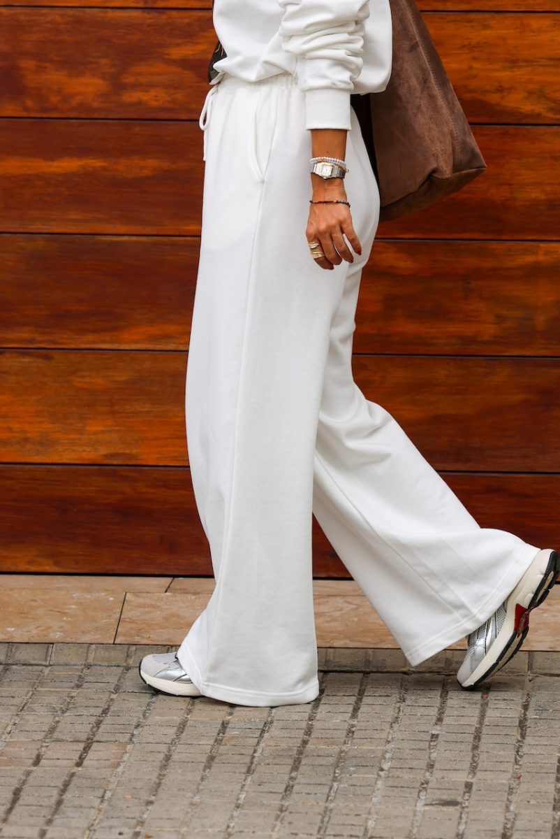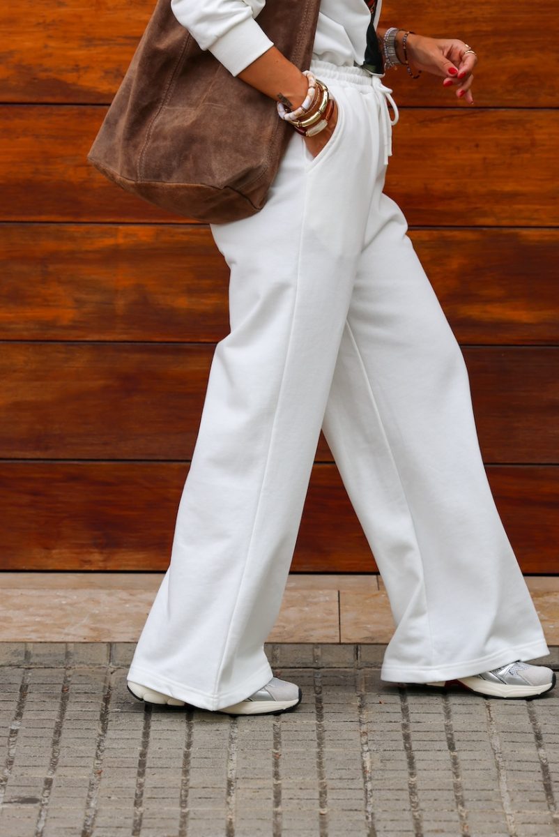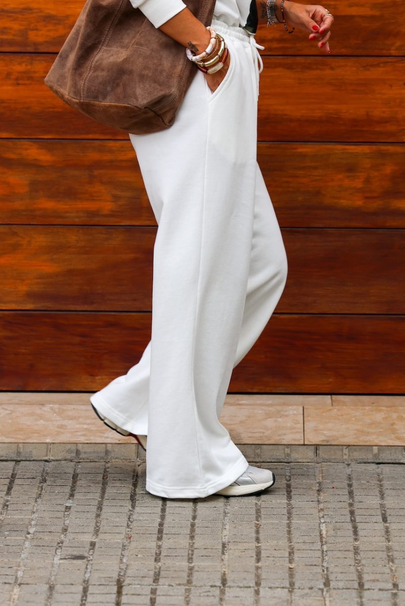 Pantaloon wide leg en blanco. Corte recto y amplio, con caída fluida. Cintura elástica con cordón ajustadle para mayor comodidad. Tallaje doble, la modelo lleva la talla SM. Tallaje completo.