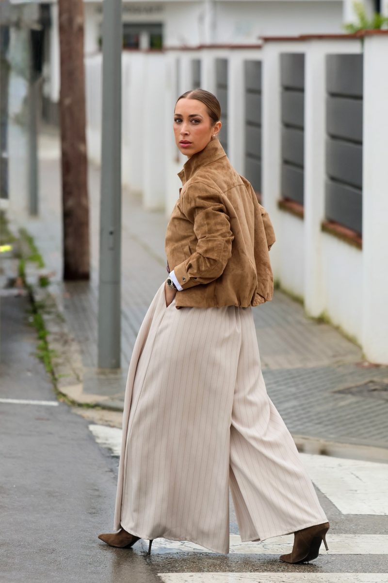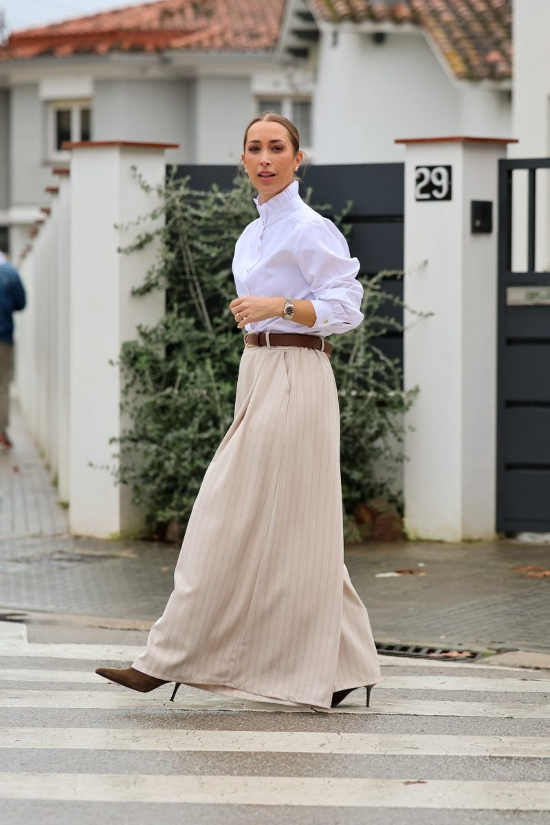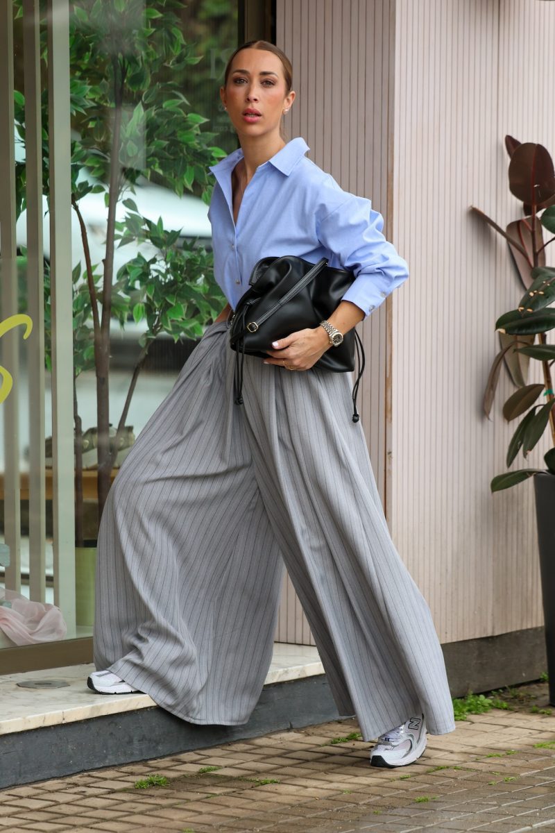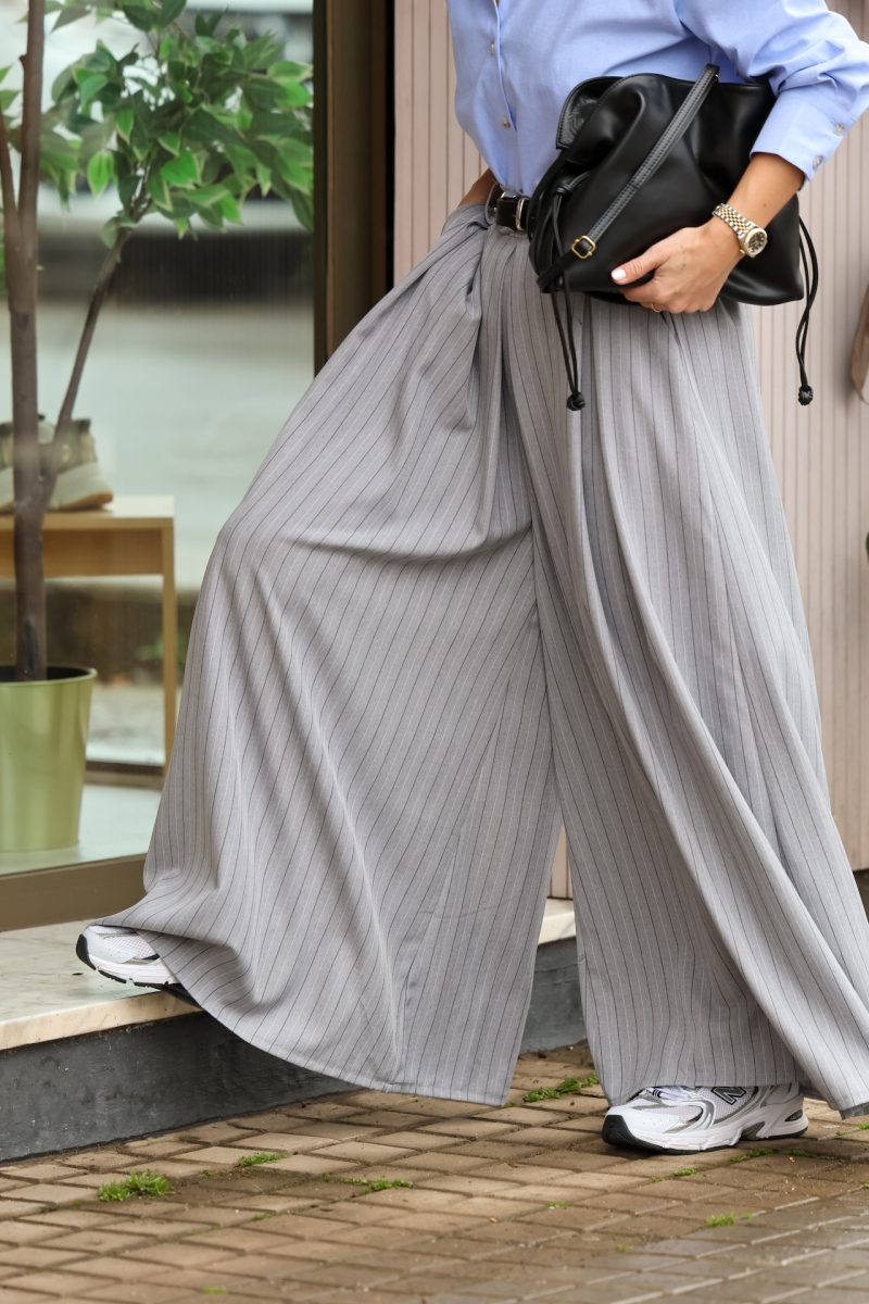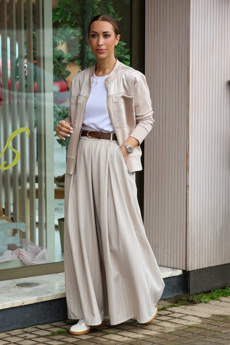 Pantalón palazzo de rayas, una prenda elegante y versátil que estiliza la silueta y aporta movimiento a cada paso. Confeccionado en un tejido fluido y ligero, destaca por su diseño de rayas verticales, ideal para alargar visualmente la pierna.