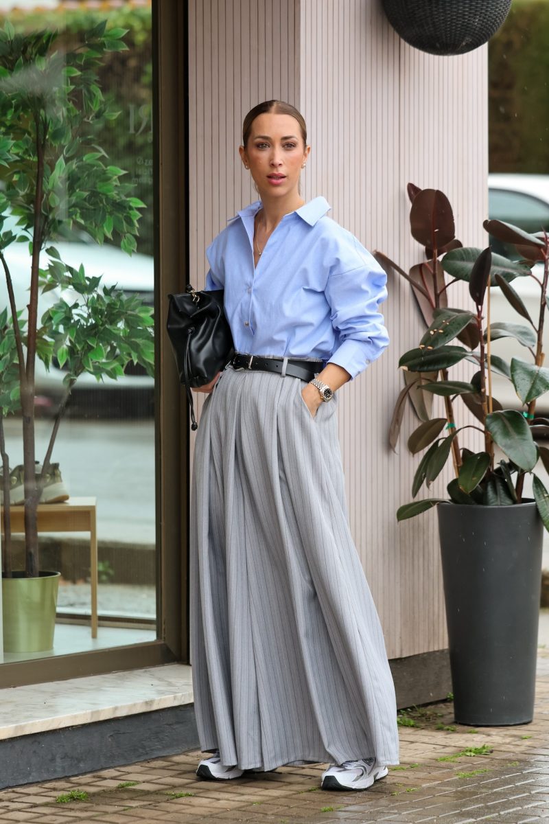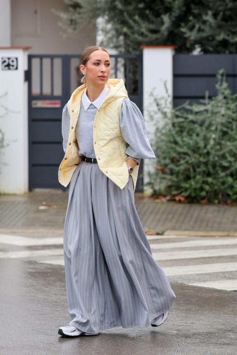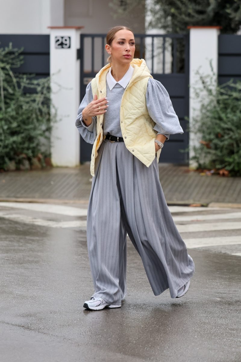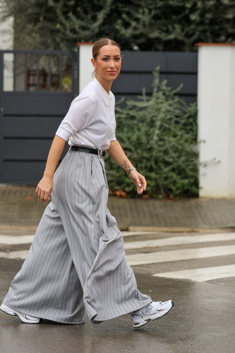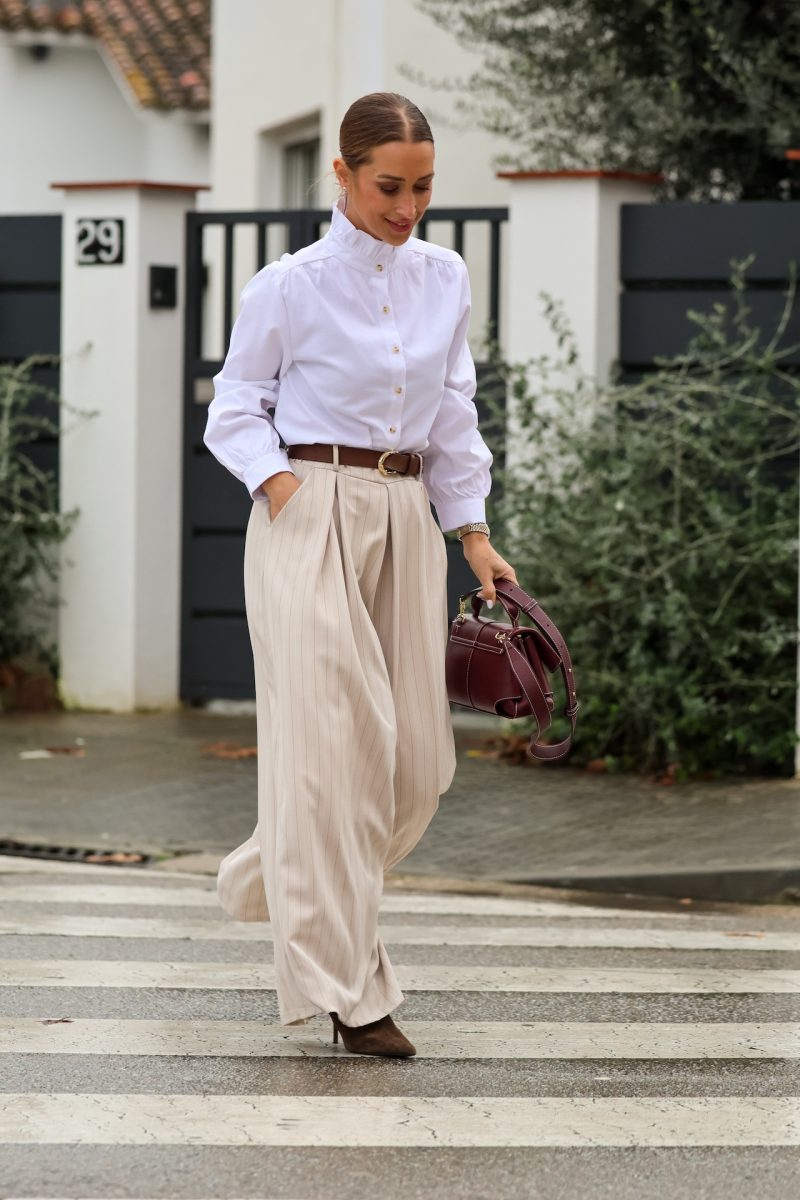 Pantalón palazzo de rayas, una prenda elegante y versátil que estiliza la silueta y aporta movimiento a cada paso. Confeccionado en un tejido fluido y ligero, destaca por su diseño de rayas verticales, ideal para alargar visualmente la pierna.