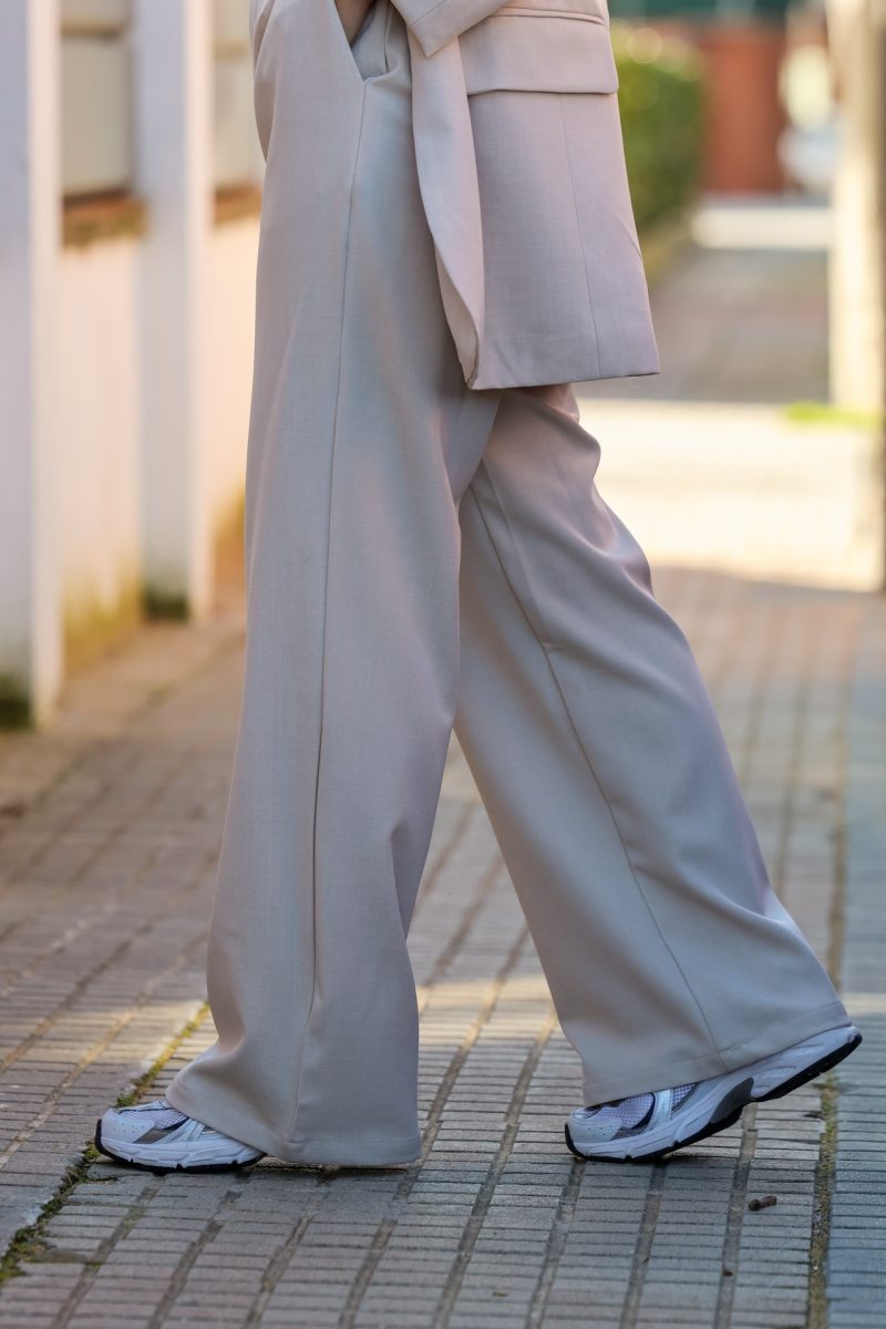 Pantalón de pinzas en tono beige, con pierna ancha y tejido fluido que aporta caída y movimiento. Diseño de tiro medio-alto, con cierre frontal y bolsillos, pensado para estilizar la silueta sin renunciar a la comodidad.