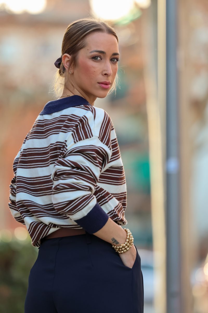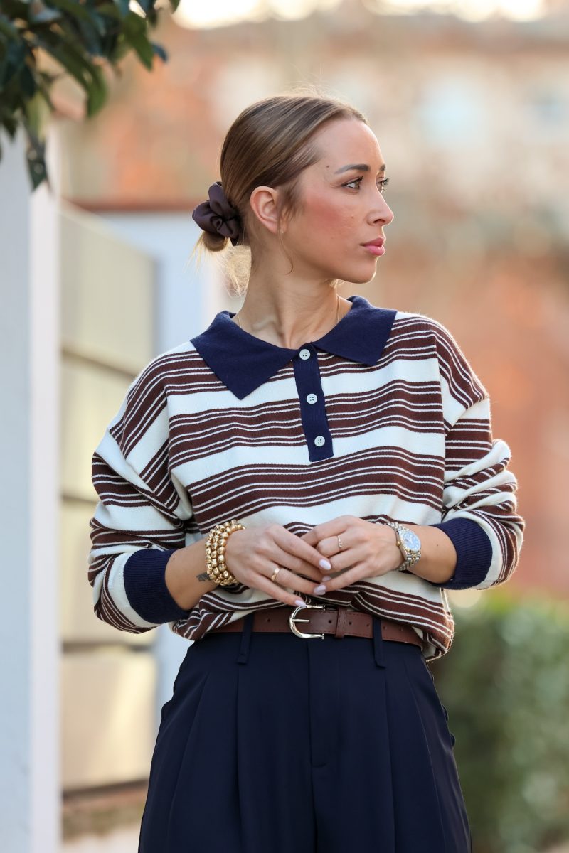 Polo de rayas marrón con cuello contrastado, diseño cómodo y favorecedor. Su corte relajado y el detalle del cuello lo convierten en una prenda versátil, ideal para looks de diario o estilismos más cuidados. Fácil de combinar con pantalones de vestir o vaqueros para un outfit atemporal y elegante.