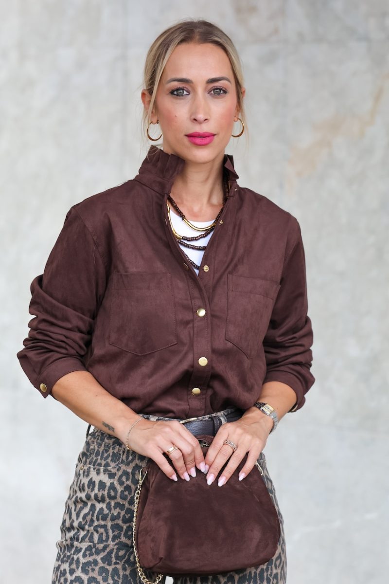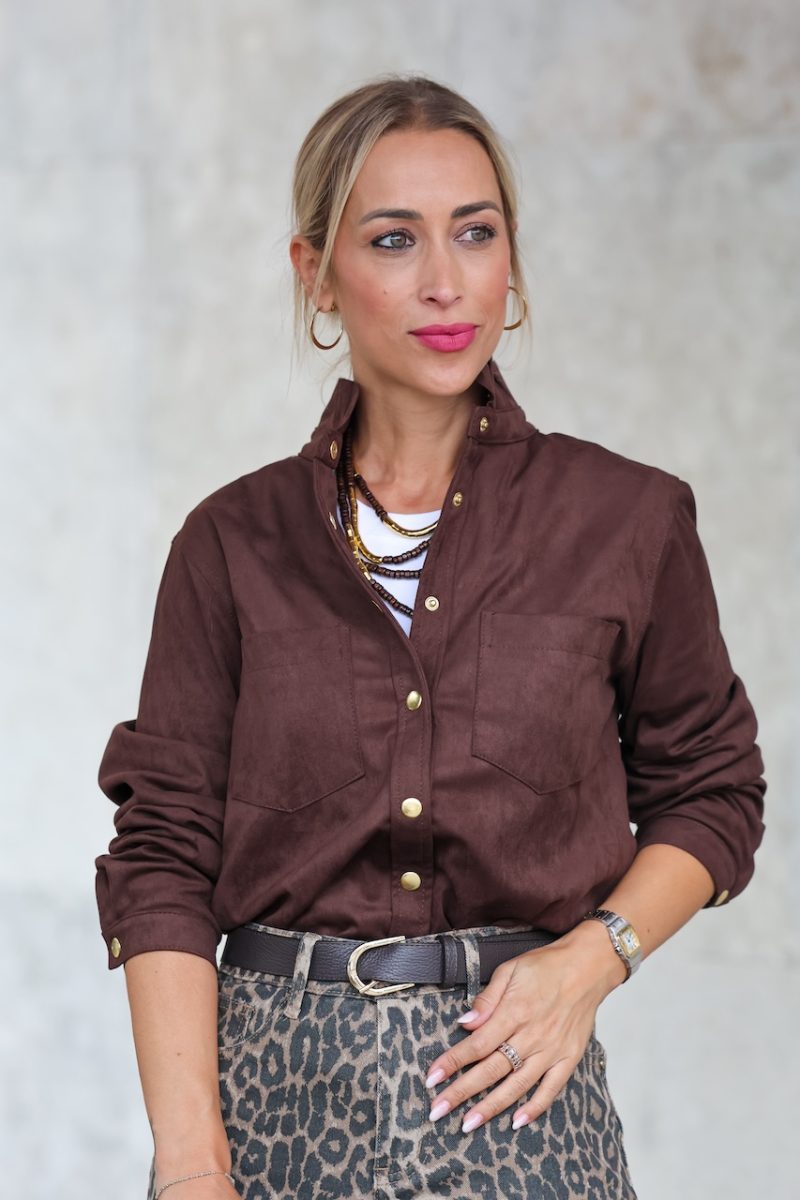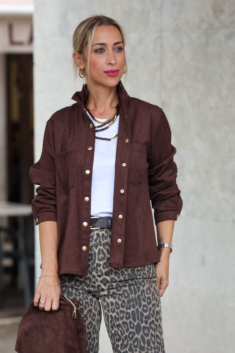 Camisa o sobrecamas de antelina con botones dorados en la parte delantera. Cuello alto fruncido.