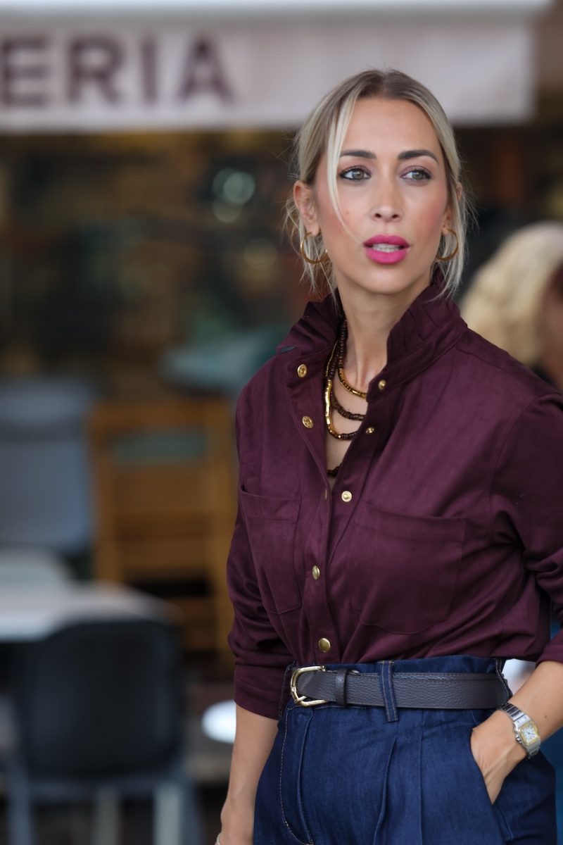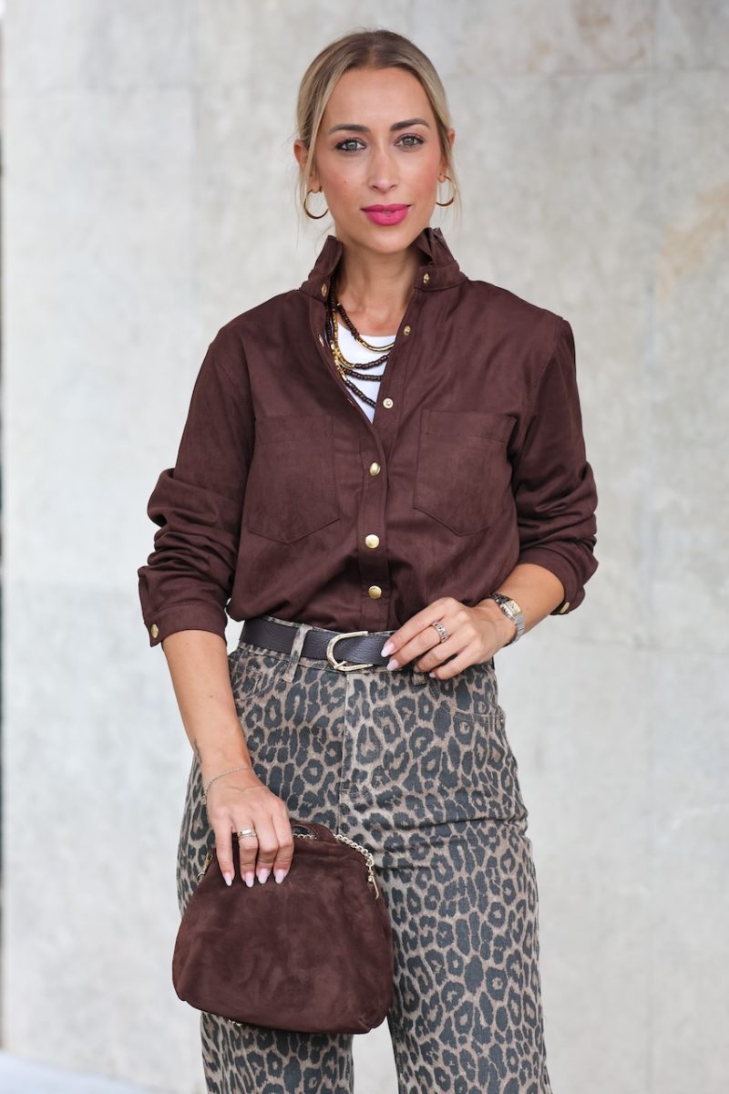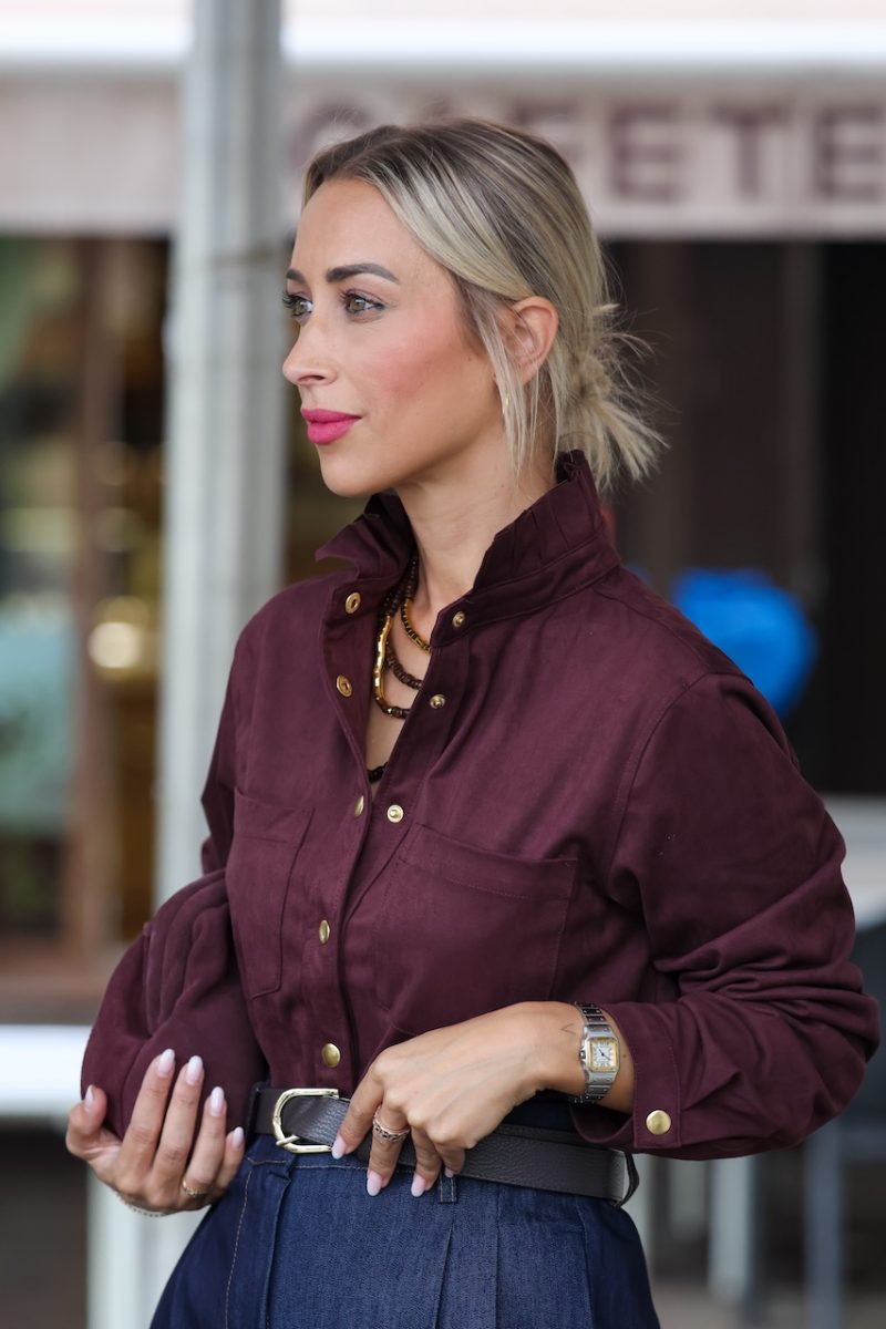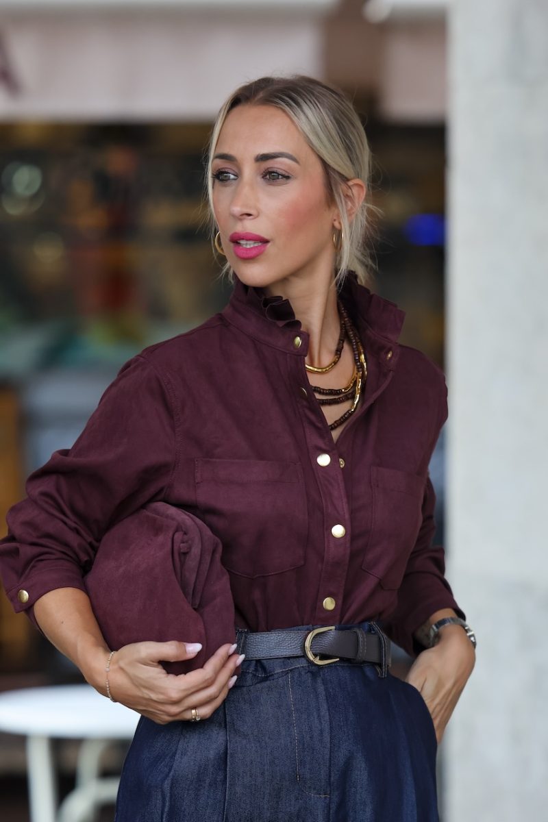 Camisa o sobrecamas de antelina con botones dorados en la parte delantera. Cuello alto fruncido.