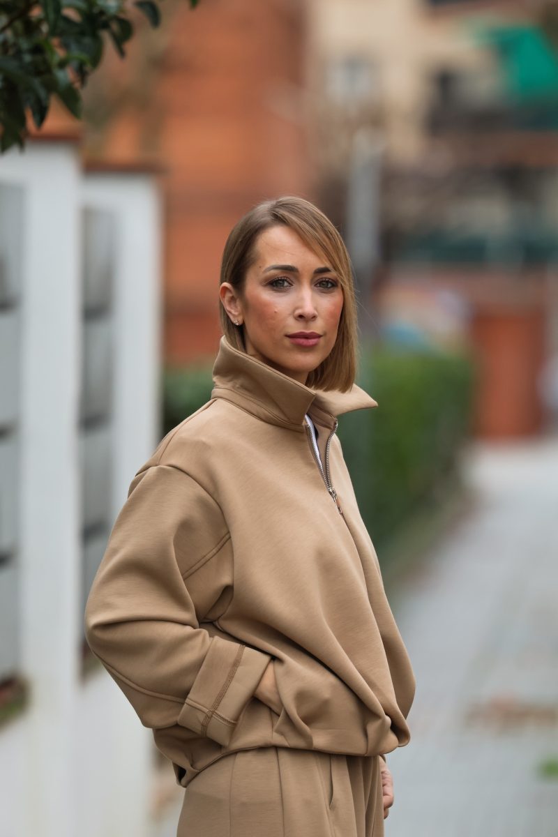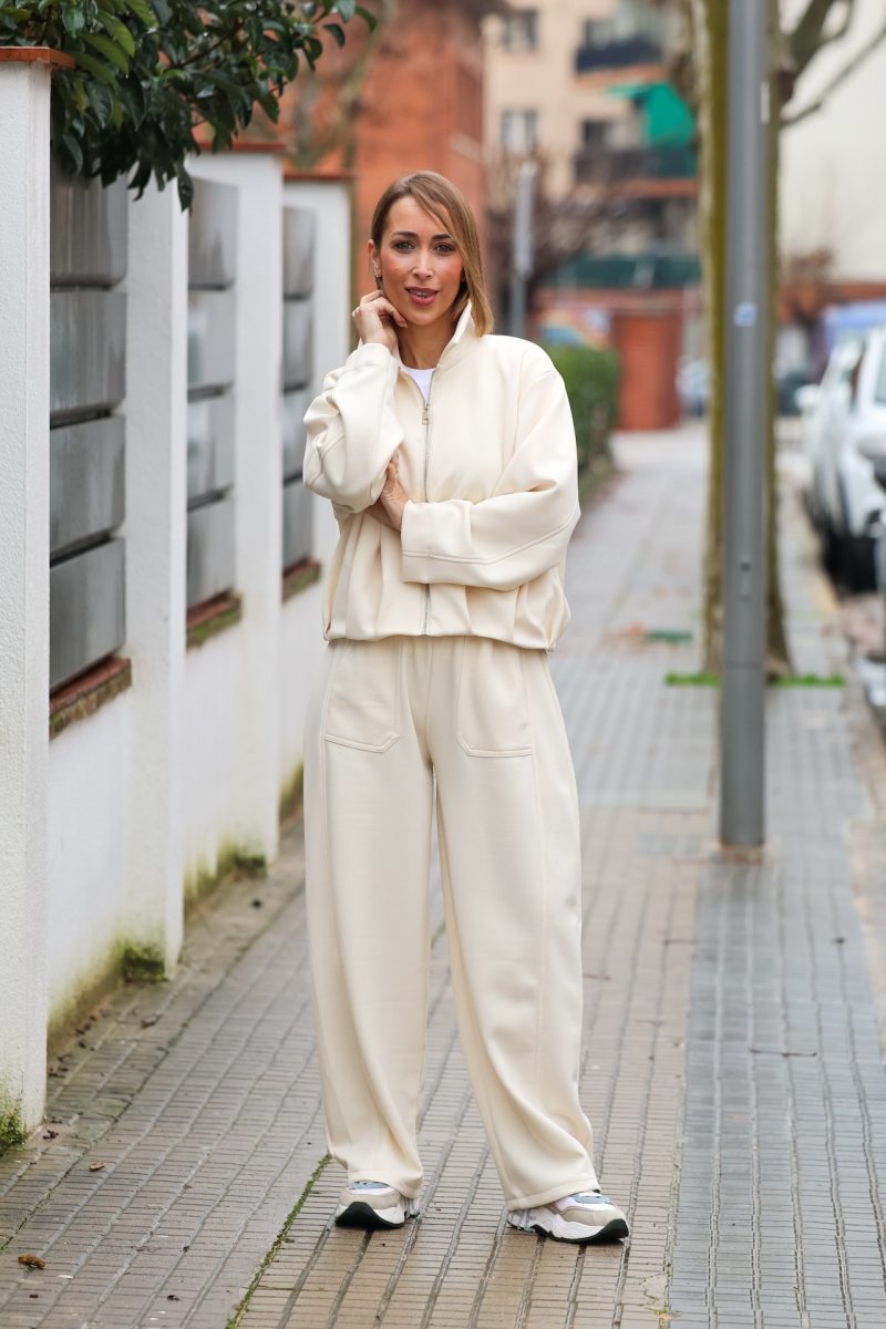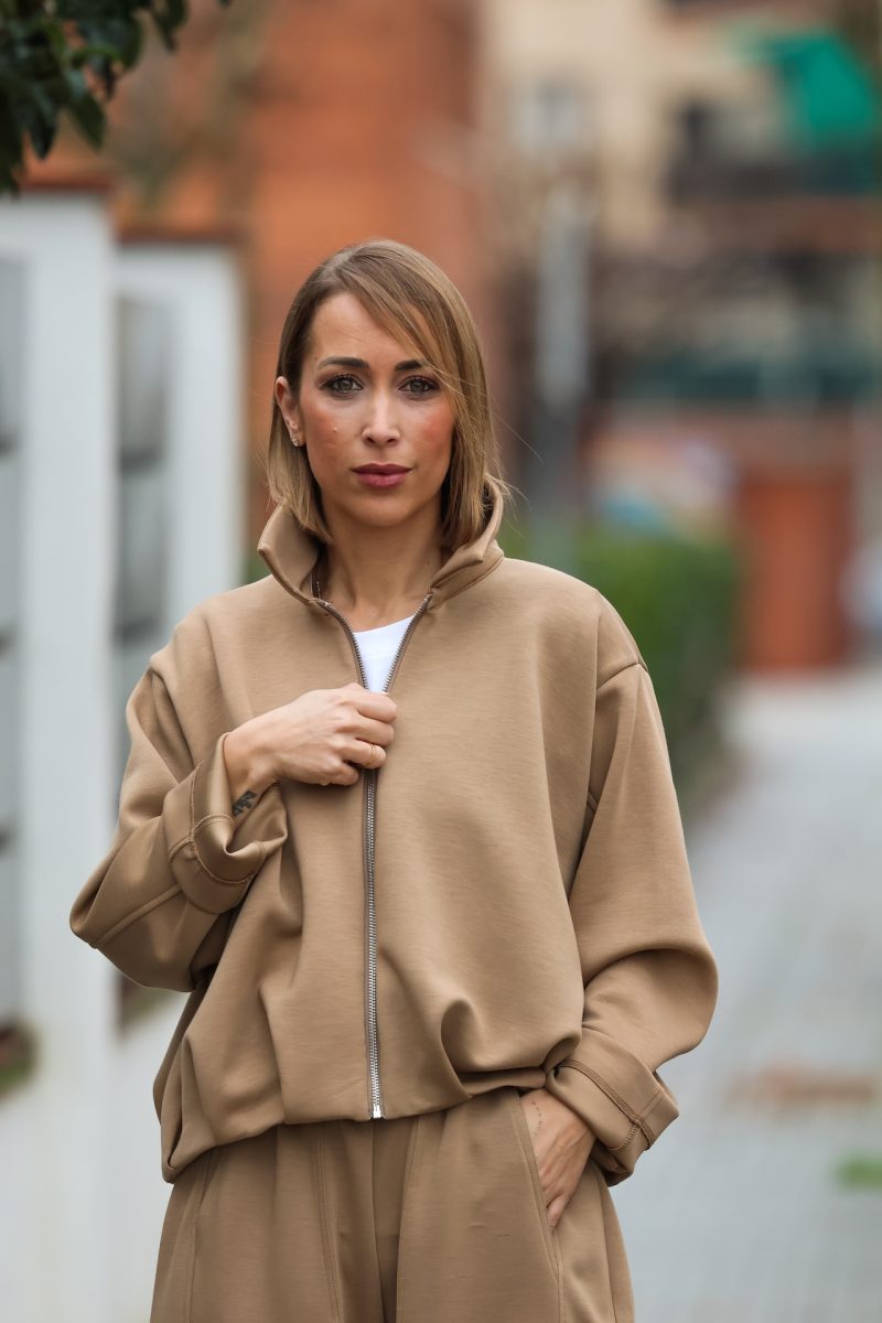 La cremallera frontal y el cuello ligeramente alto aportan funcionalidad y un estilo moderno, perfecto para llevar tanto en looks casual como en conjuntos coordinados. Ideal para combinar con pantalones a juego o con jeans, creando estilismos cómodos y versátiles.