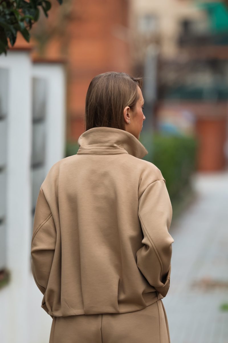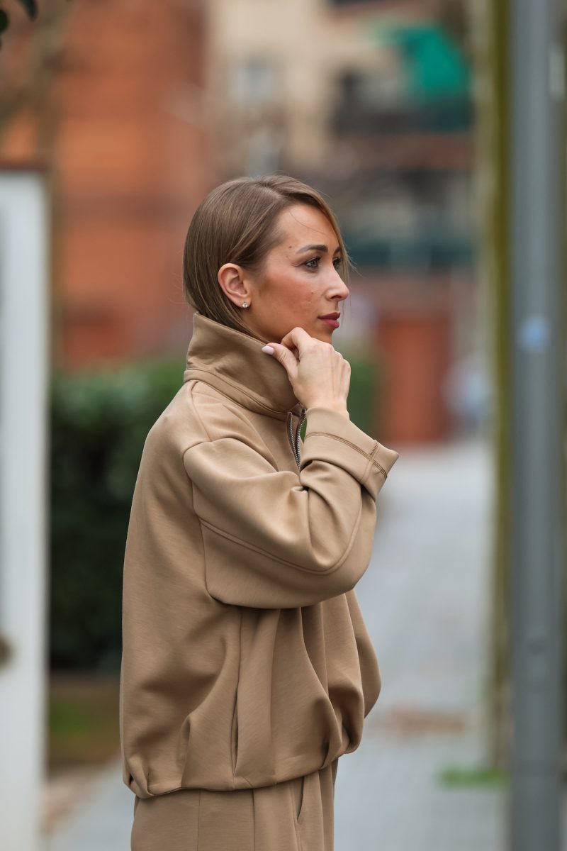 Sudadera con cremallera en tonos neutros, disponible en beige y camel, una prenda cómoda y actual pensada para acompañarte en tu día a día. Confeccionada en un tejido suave y agradable, destaca por su diseño minimalista y su corte relajado, que aporta libertad de movimiento y un ajuste favorecedor.