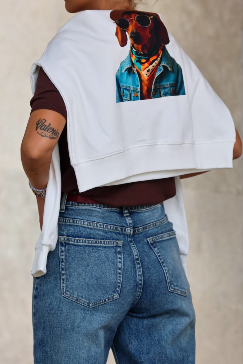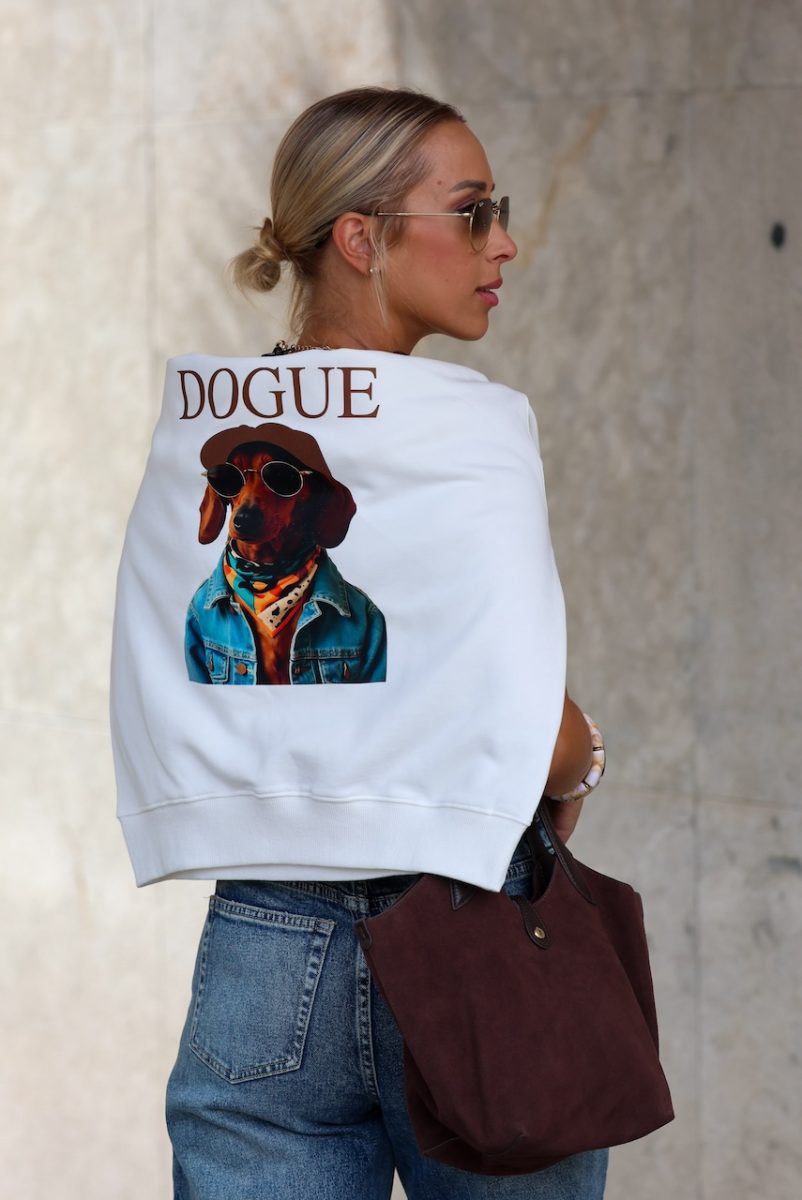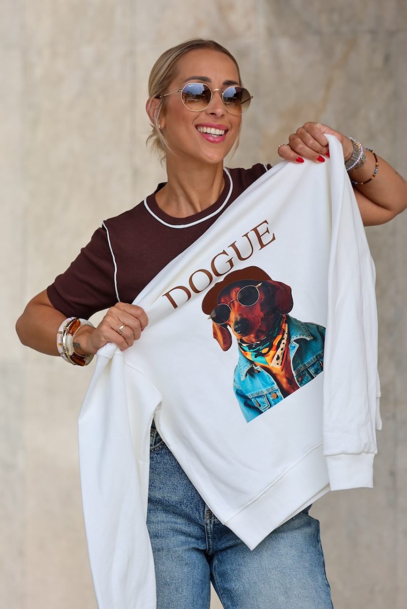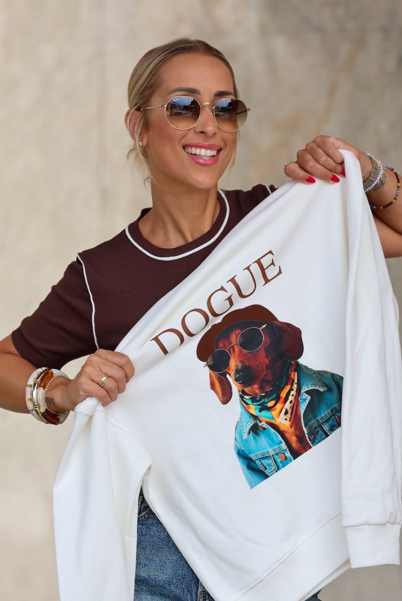 Sudadera blanca estampada DOGUE en color marrón. Corte holgado, con cuello redondo y mangas largas. Material de tejido suave, ideal para el día a día. Puños fruncidos. Talla única completa, hasta talla xl. Hace conjunto con pantalón blanco dogue.