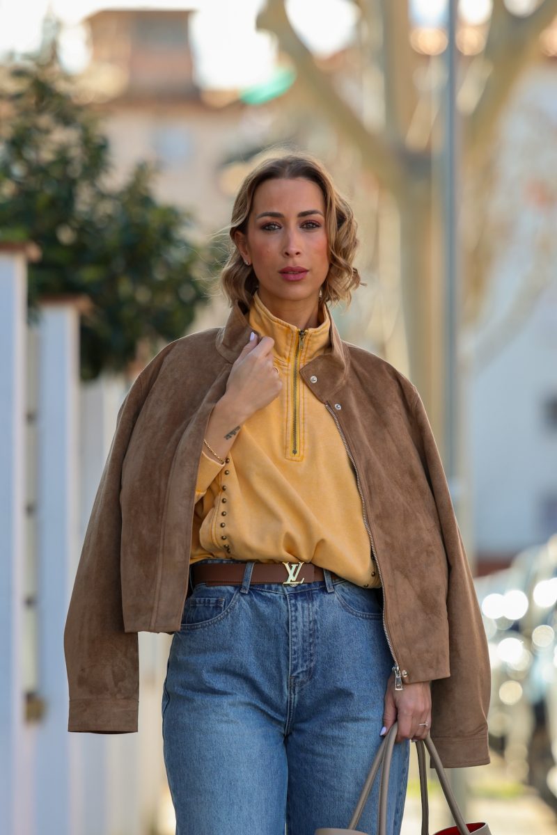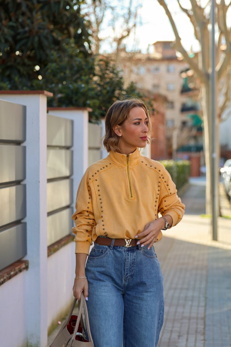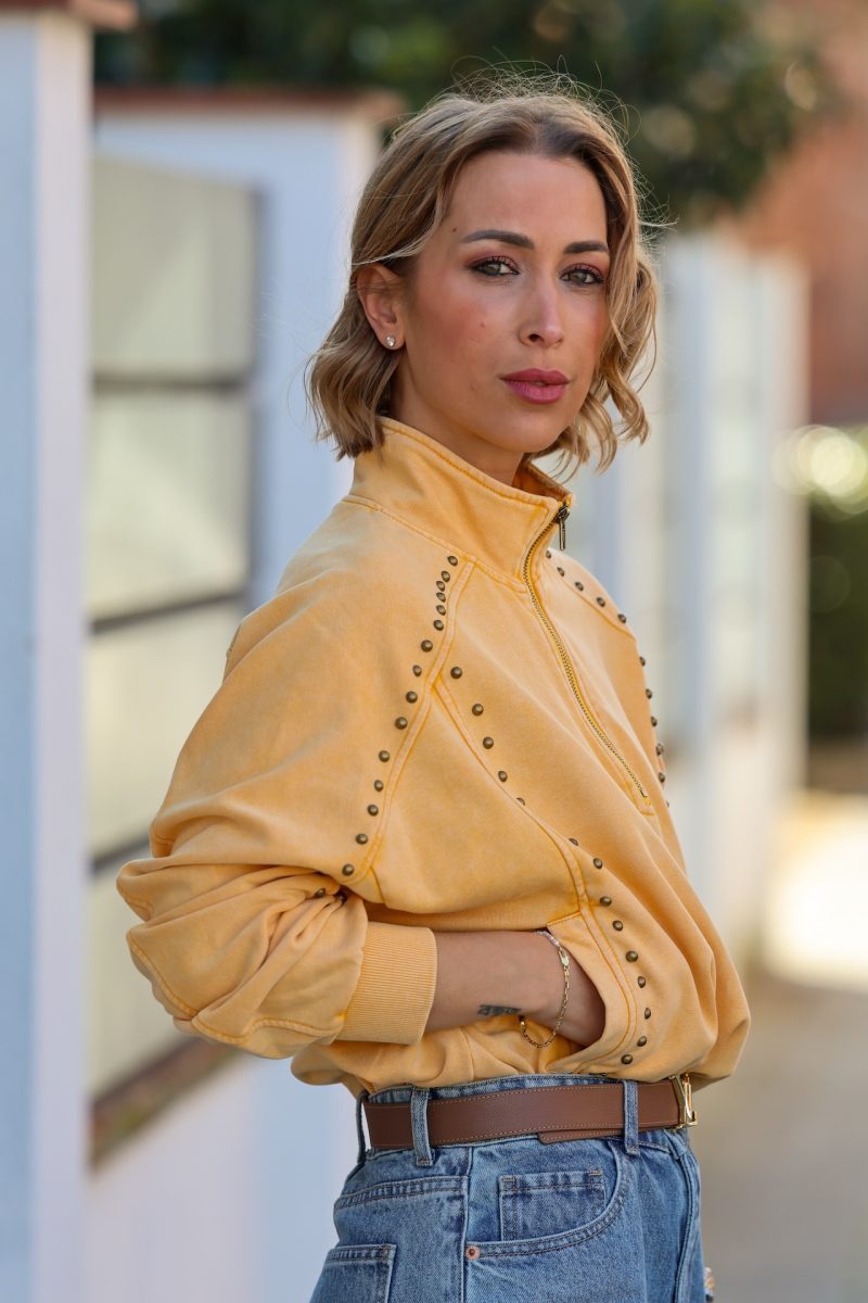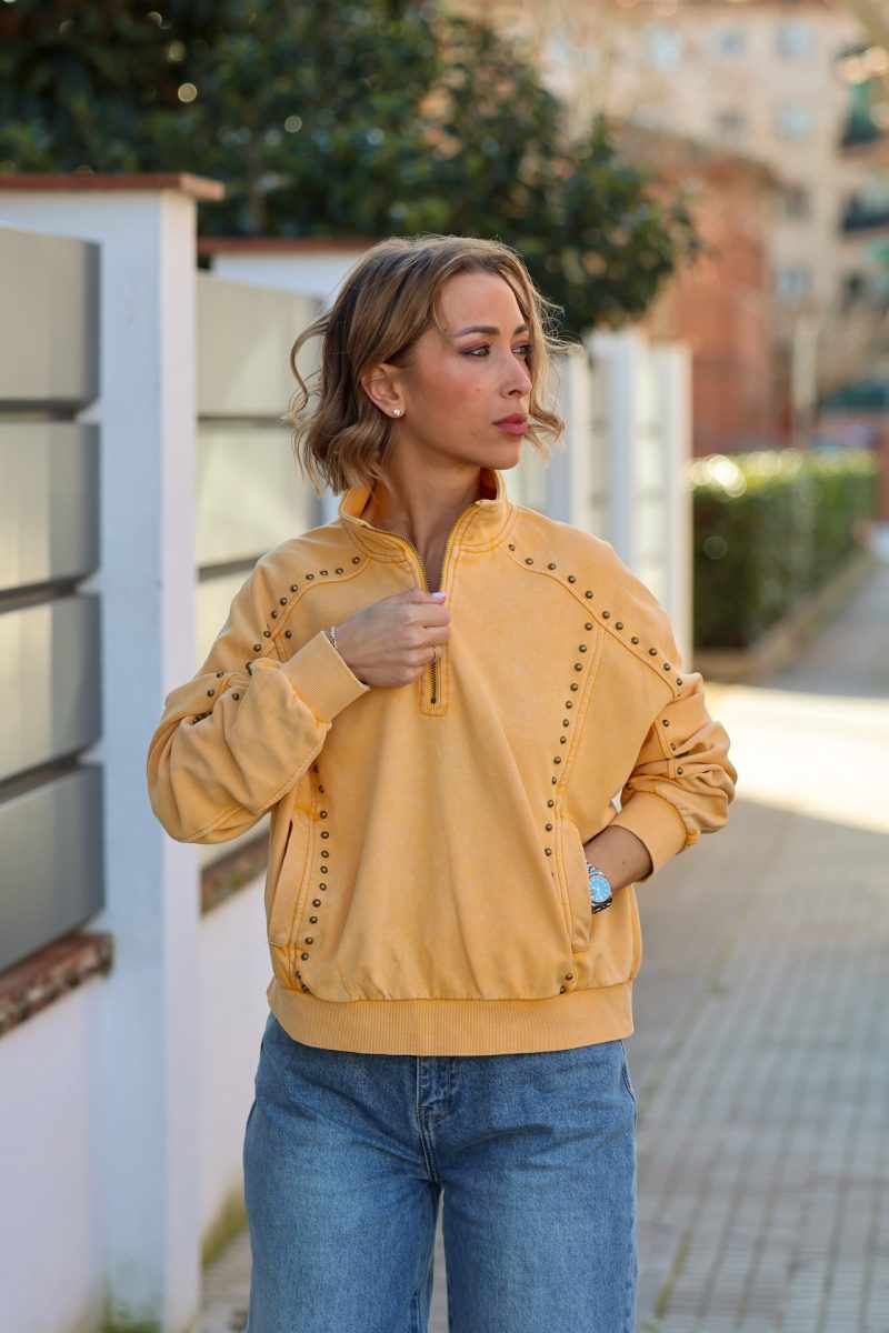 Sudadera en tono orange con cierre de media cremallera, bolsillos laterales y tachas decorativas que recorren el diseño aportando un toque especial. Corte relajado y tejido cómodo, ideal para elevar looks casuales con personalidad.