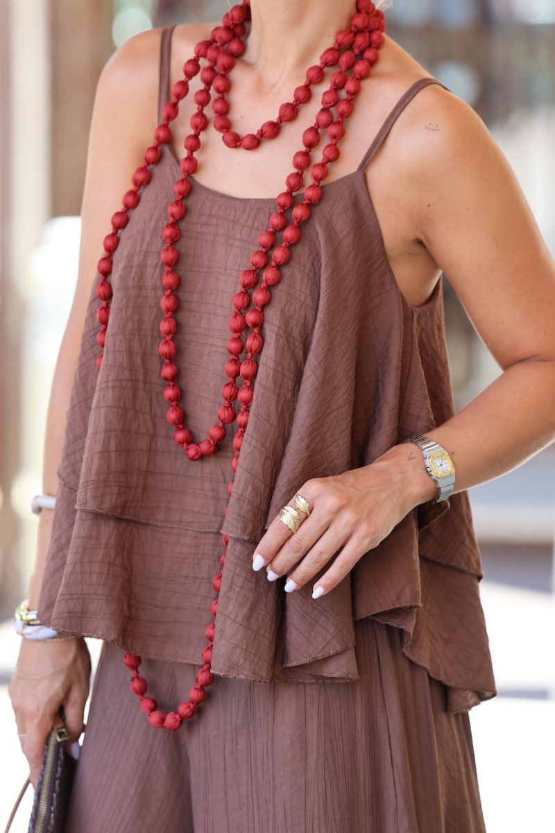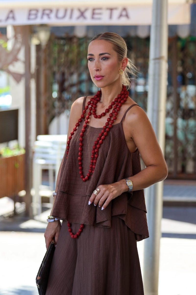 Top de volante con tirante fino en color marrón chocolate. Talla única hasta talla L.