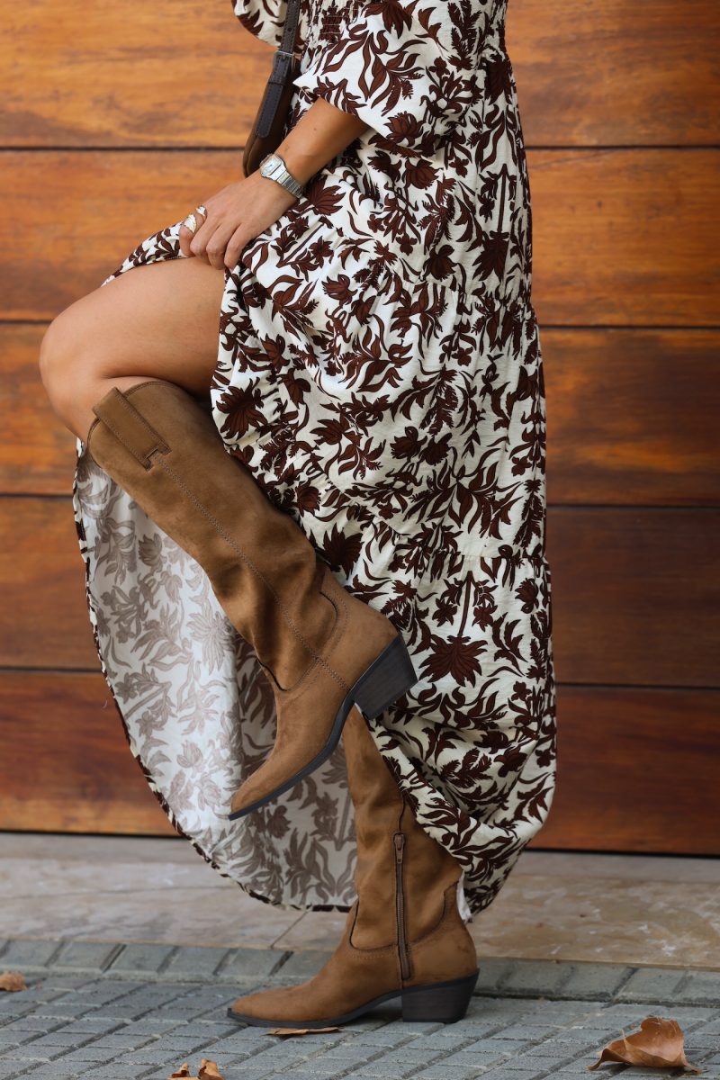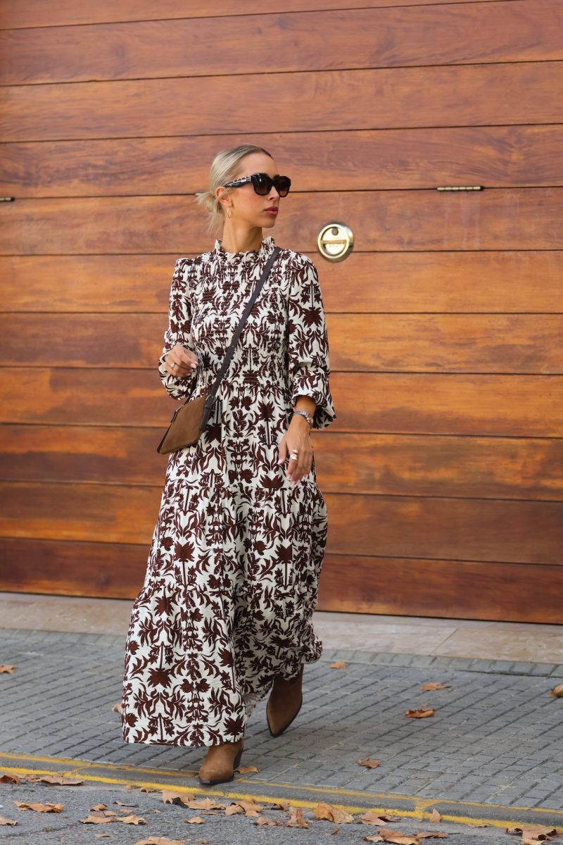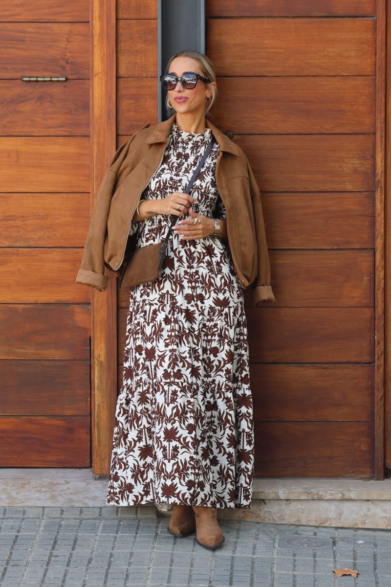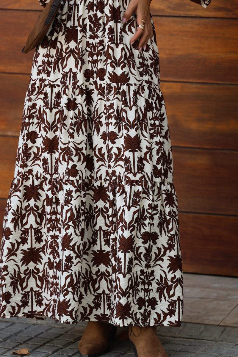 Vestido largo con estampado en tonos marrón chocolate sobre fondo beige. La parte superior presenta un fruncido elástico que se adapta perfectamente a la figura, aportando comodidad y realce al busto. Su falda fluida con volante inferior crea un movimiento natural y favorecedor.