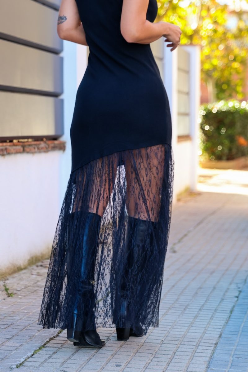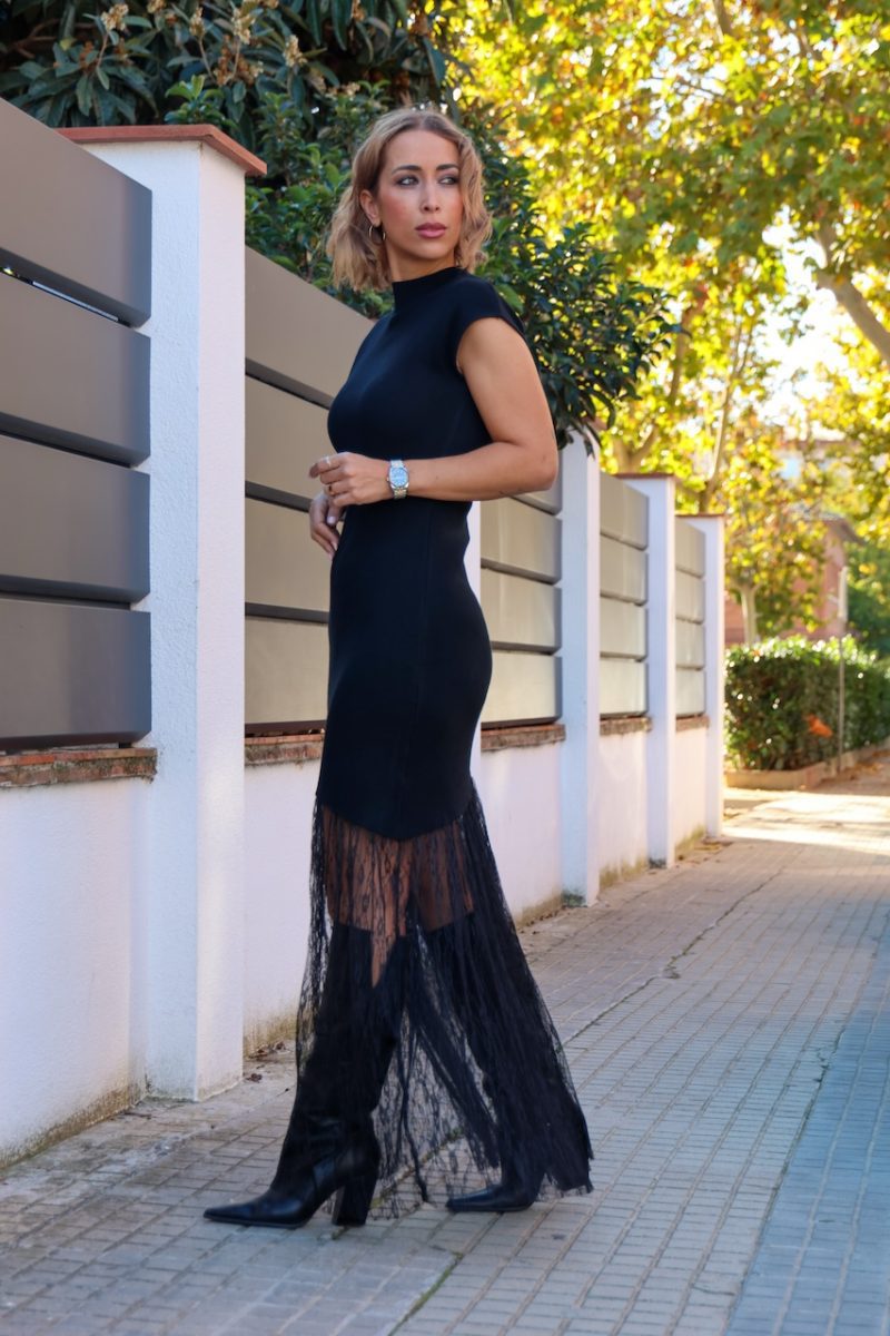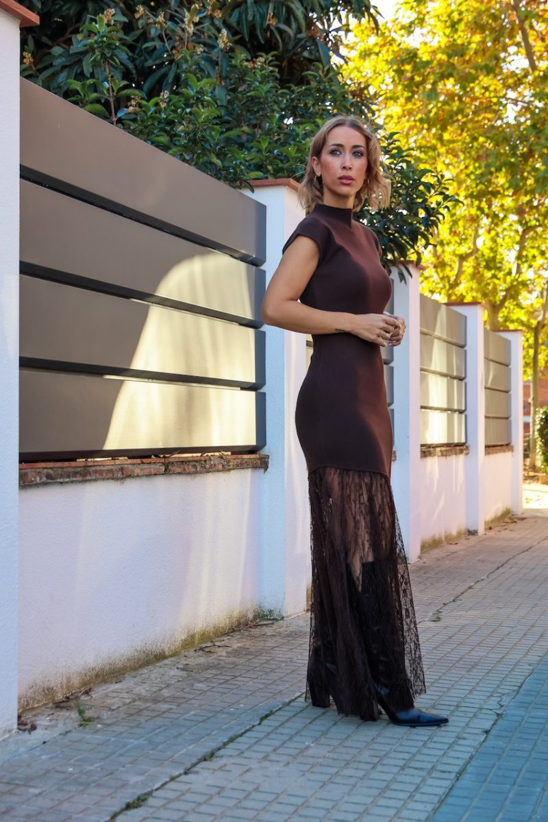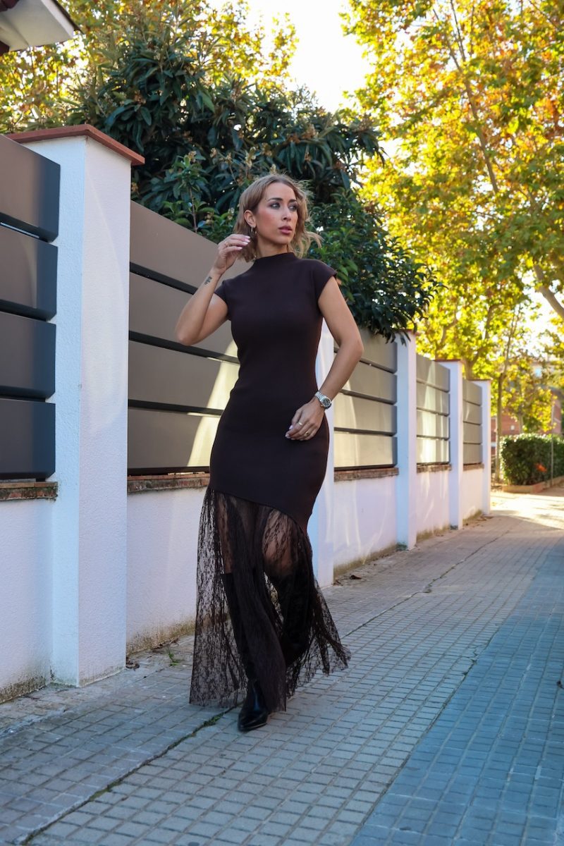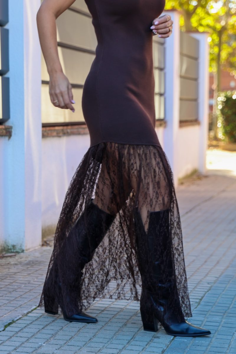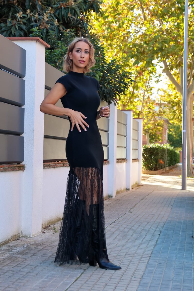 Vestido de punto ajustado con caída de encaje, ideal para eventos, cenas y looks de noche. Su silueta favorecedora y su diseño minimalista lo convierten en un imprescindible de temporada.